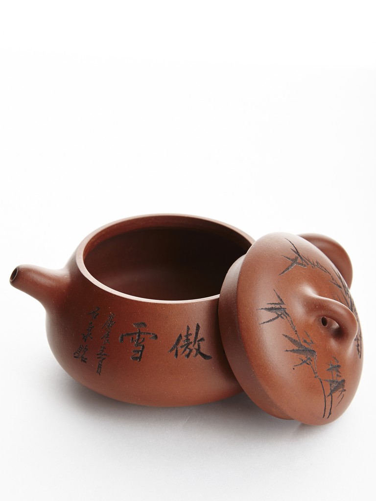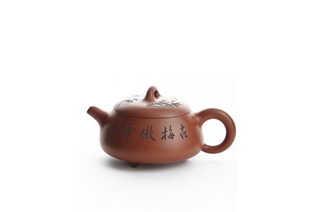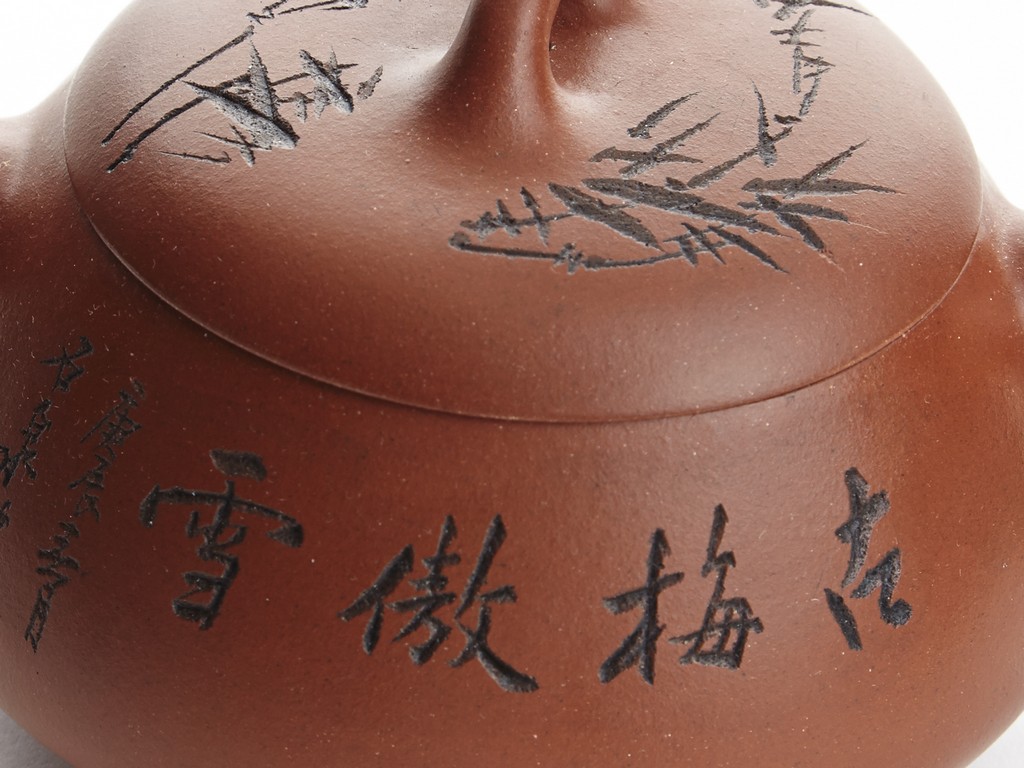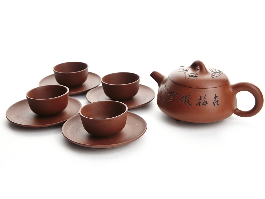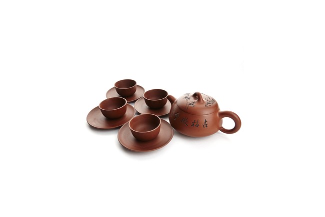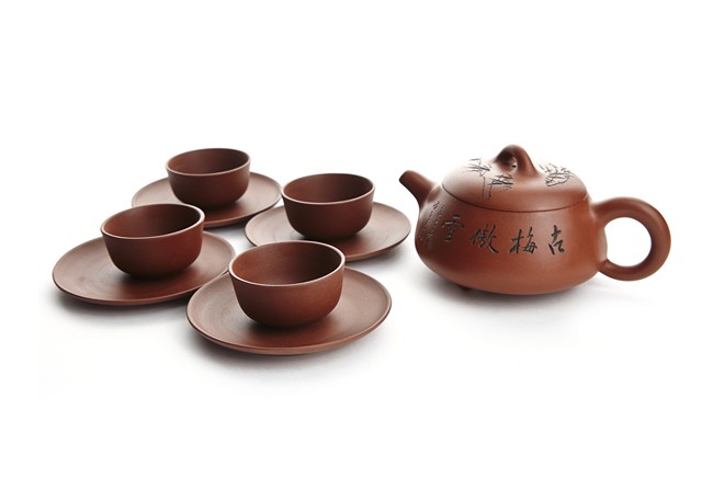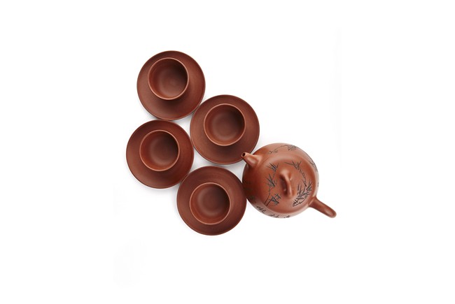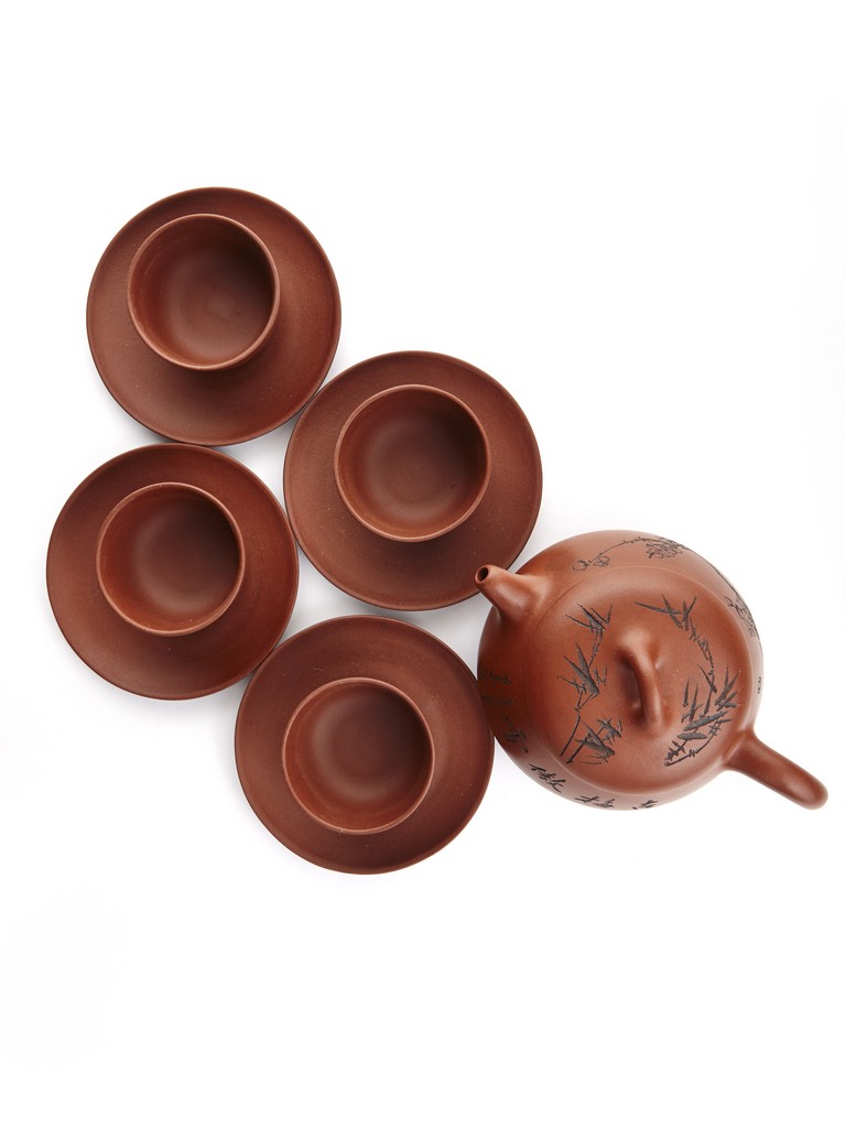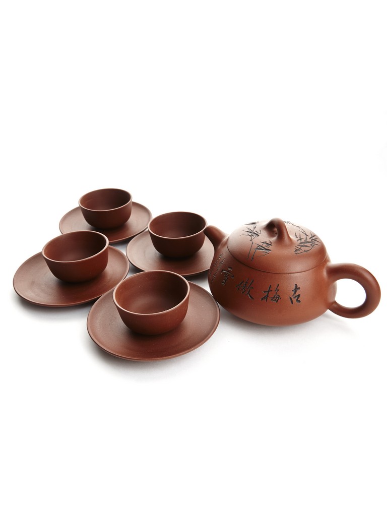 Comprising of a conical formed teapot, body finely incised with inscription and plum, cover decorated with bamboo, with looped finial and handle, the base and interior of cover with impressed marks; and four cups with trays, the base with impressed mark.