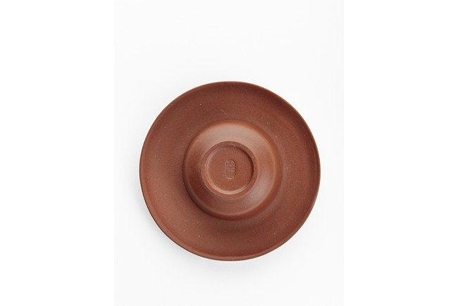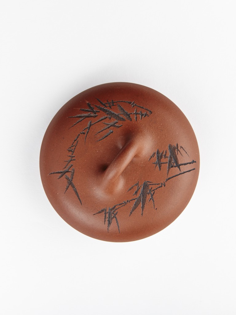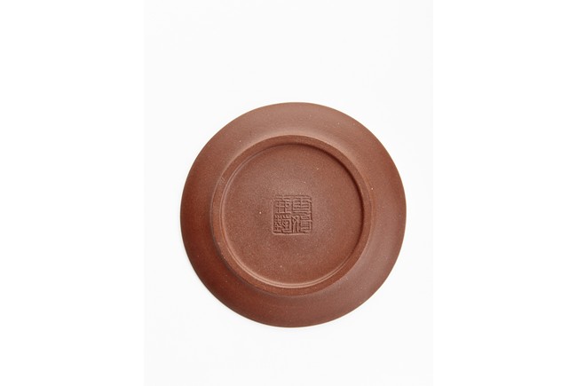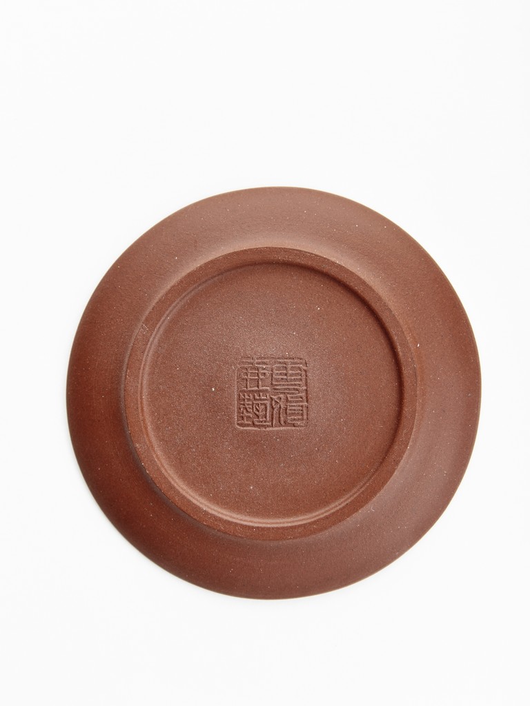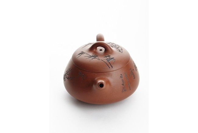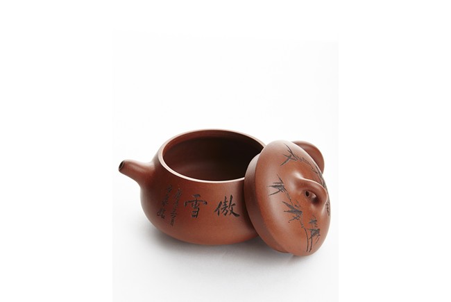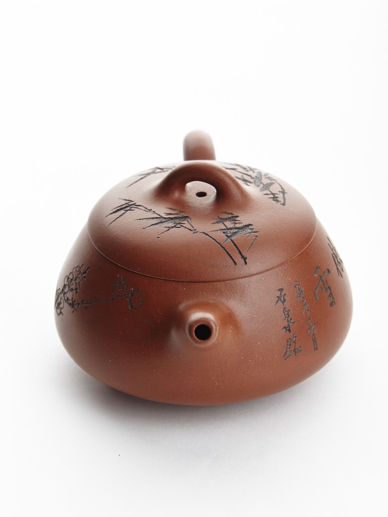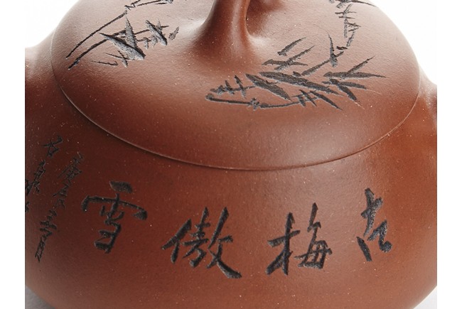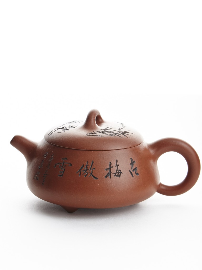 Comprising of a conical formed teapot, body finely incised with inscription and plum, cover decorated with bamboo, with looped finial and handle, the base and interior of cover with impressed marks; and four cups with trays, the base with impressed mark.