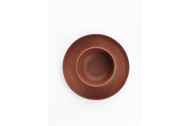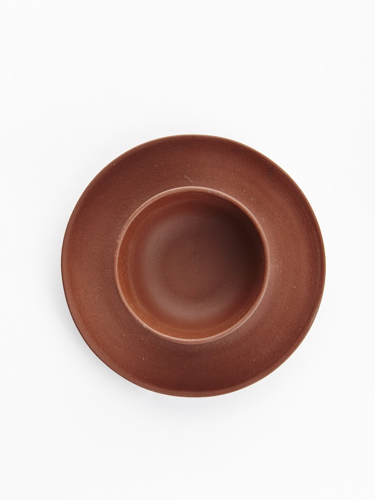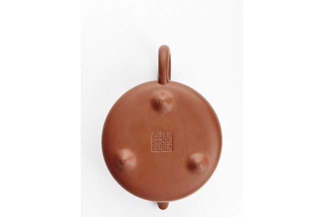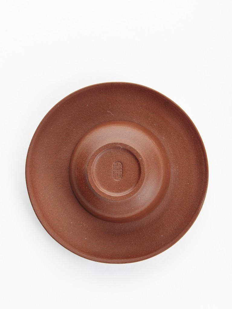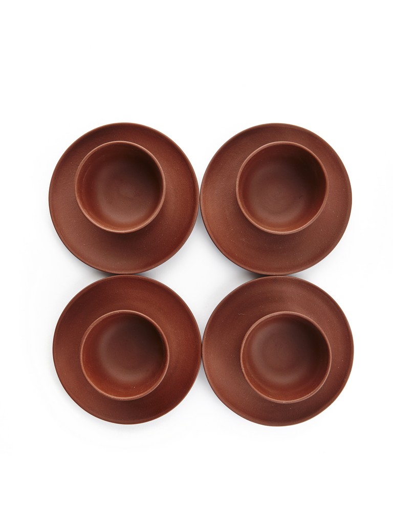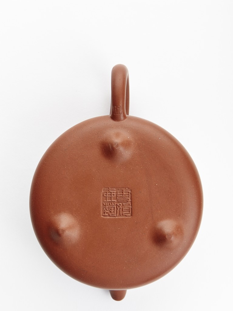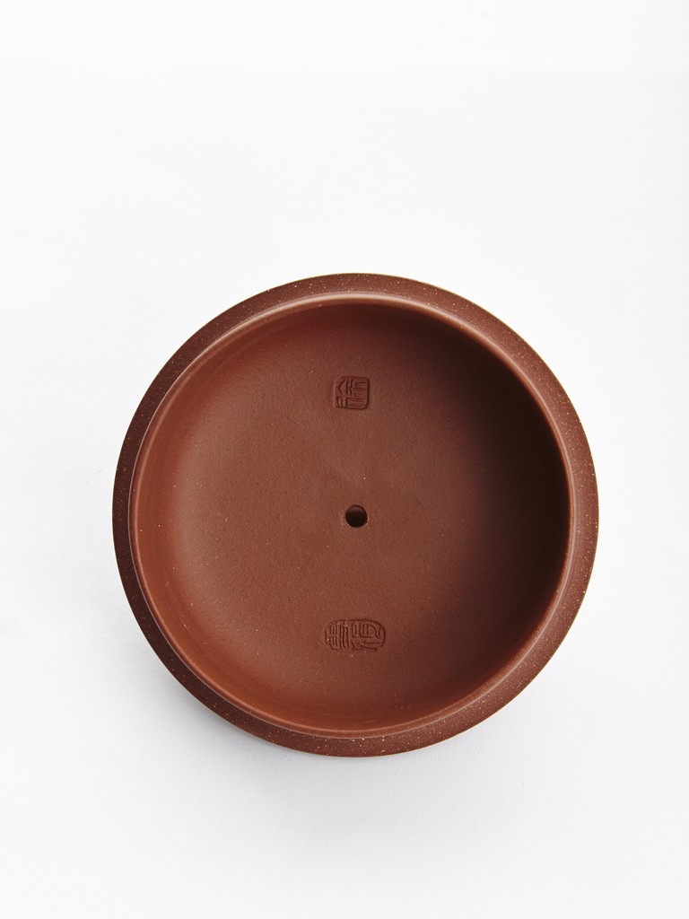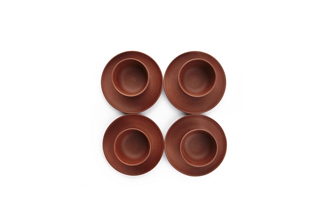 Comprising of a conical formed teapot, body finely incised with inscription and plum, cover decorated with bamboo, with looped finial and handle, the base and interior of cover with impressed marks; and four cups with trays, the base with impressed mark.
