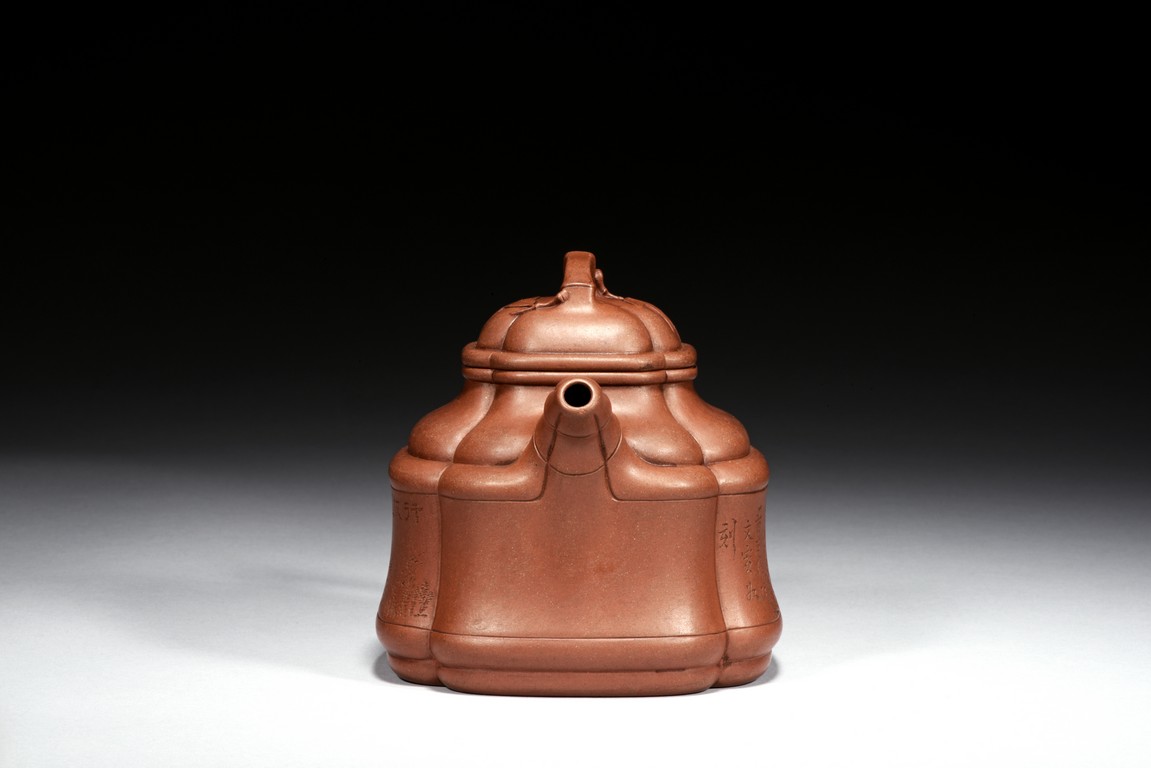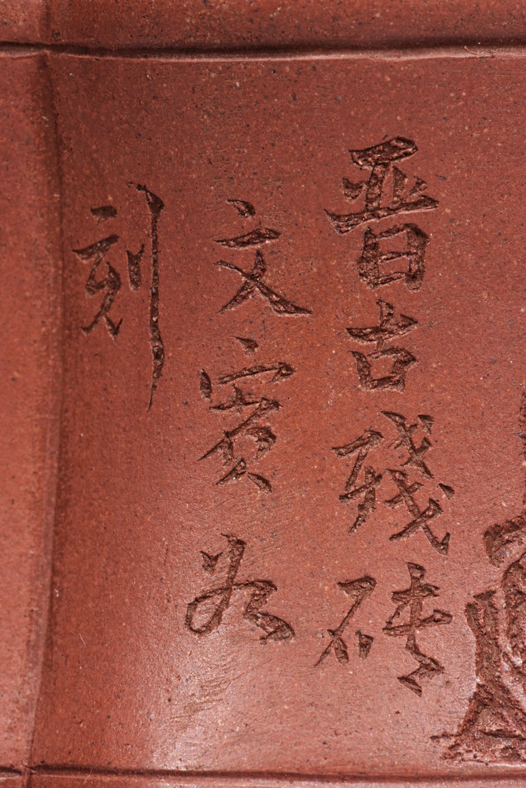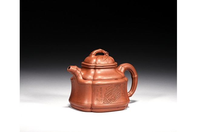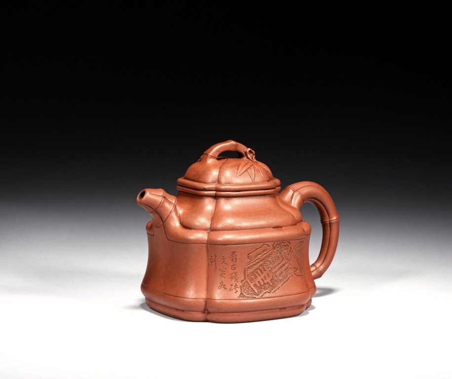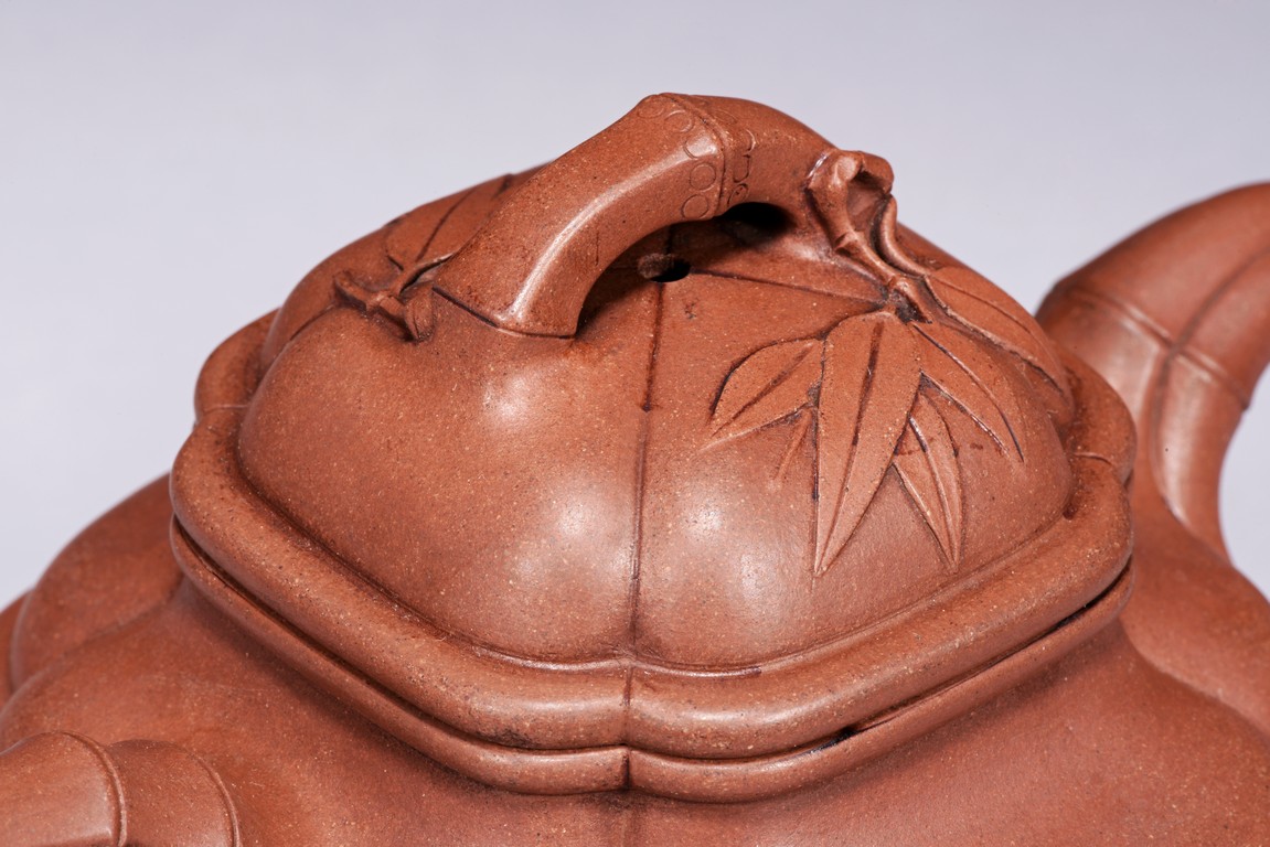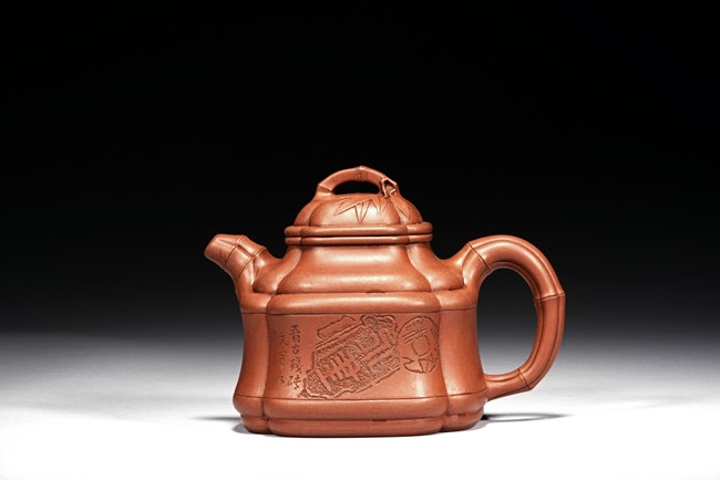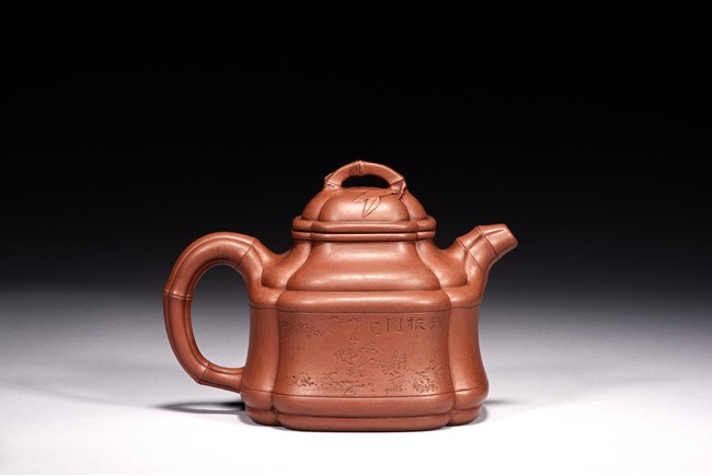 Of bamboo form with four lobes, one sides incised with landscape, the other with inscriptions and pictograph, the handle with arched bamboo shape, bamboo-formed curved spout, the finial in arched bamboo branch. The interior with two character 'Da Sheng' mark.