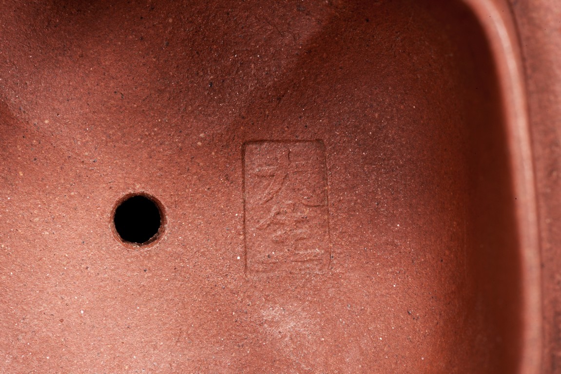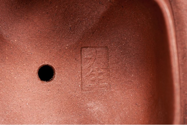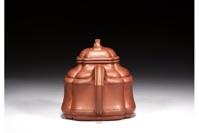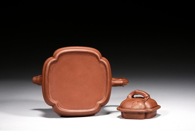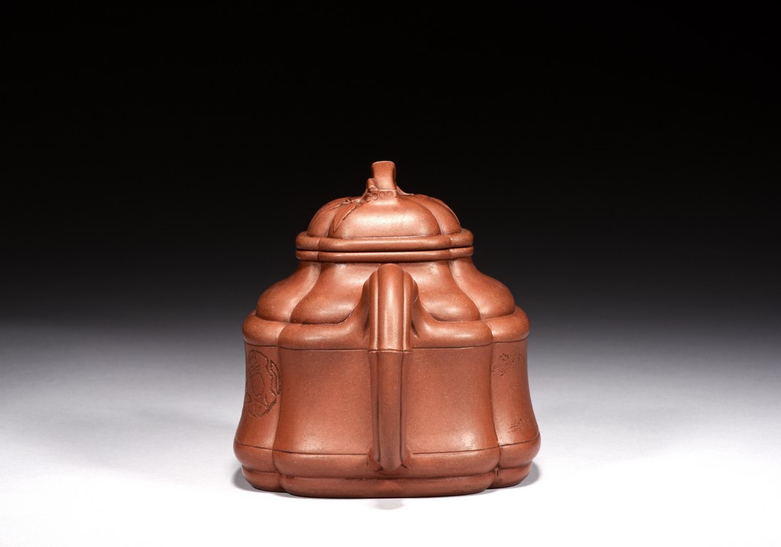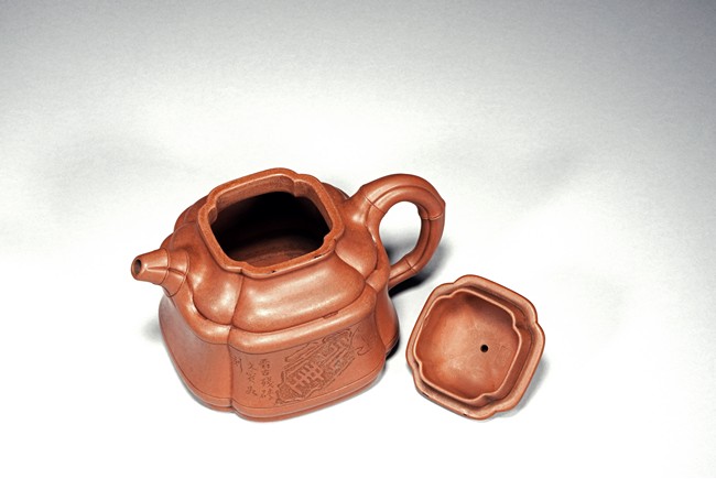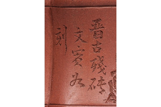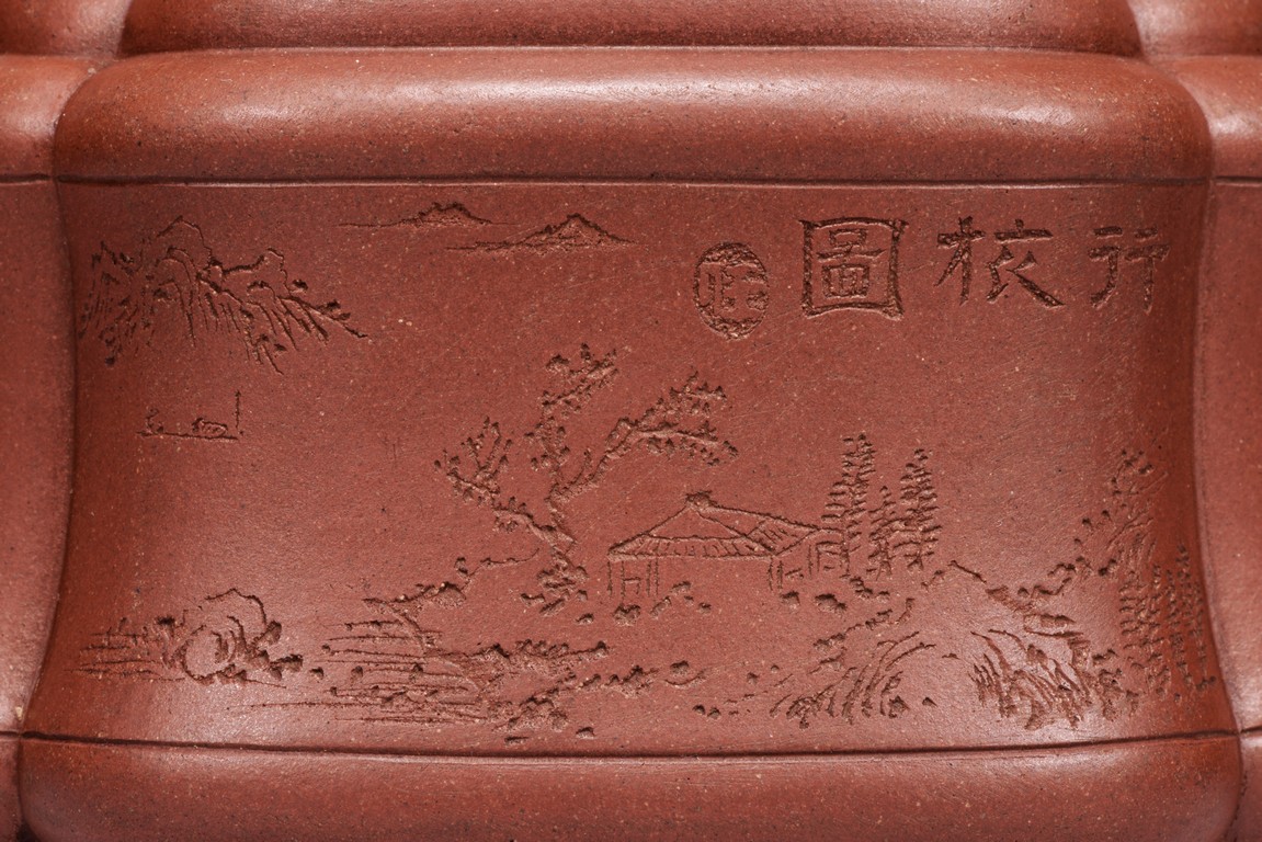 Of bamboo form with four lobes, one sides incised with landscape, the other with inscriptions and pictograph, the handle with arched bamboo shape, bamboo-formed curved spout, the finial in arched bamboo branch. The interior with two character 'Da Sheng' mark.