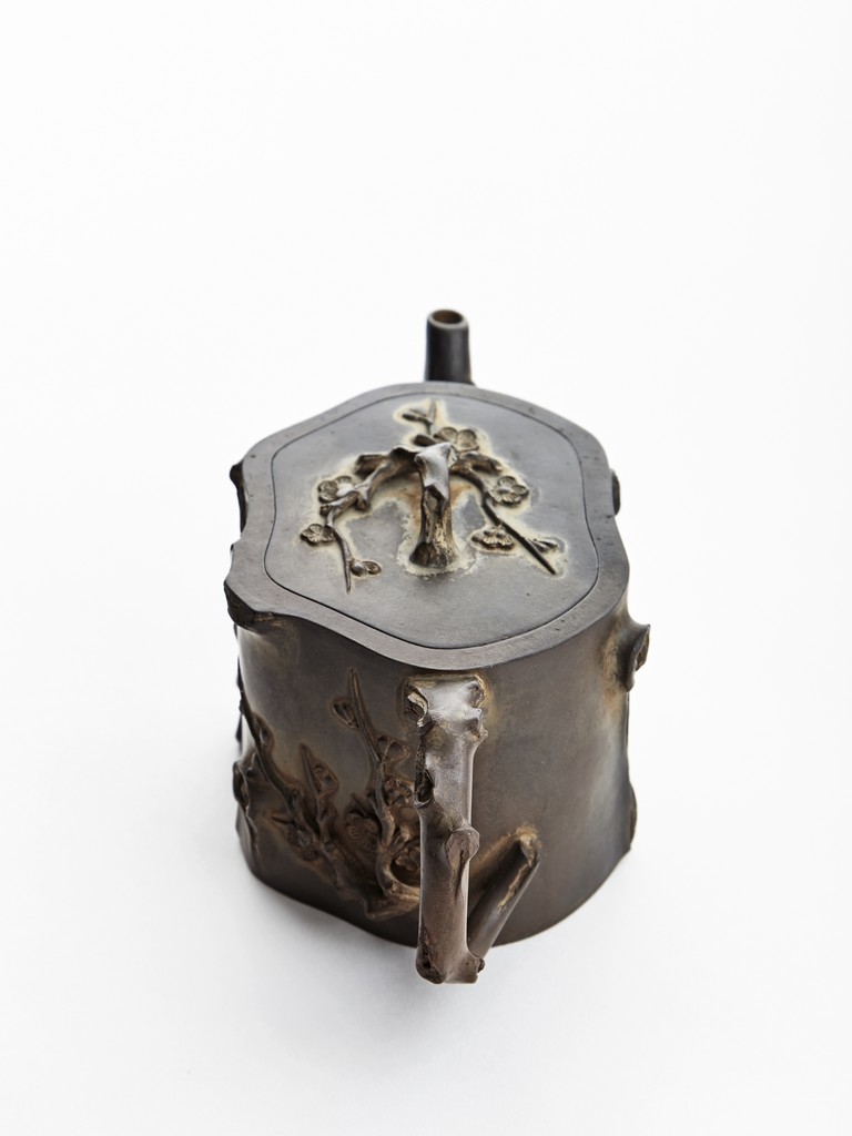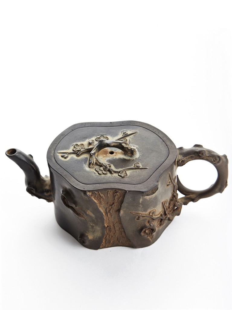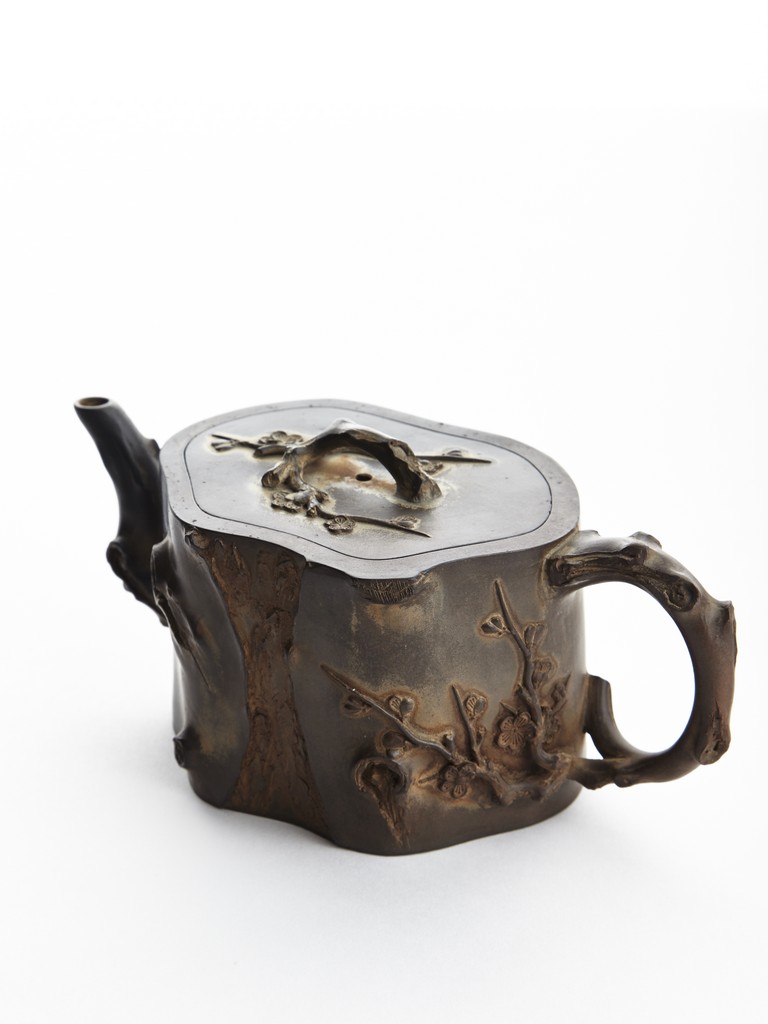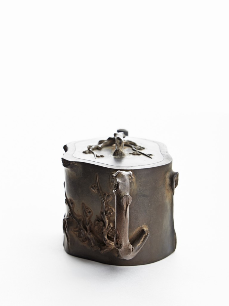 Modelled in the form of plum tree trunk, the arched handle in the form of gnarled branch, the body decorated with flowering branch in relief, the inside of cover and bottom with marks.