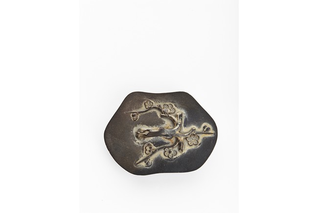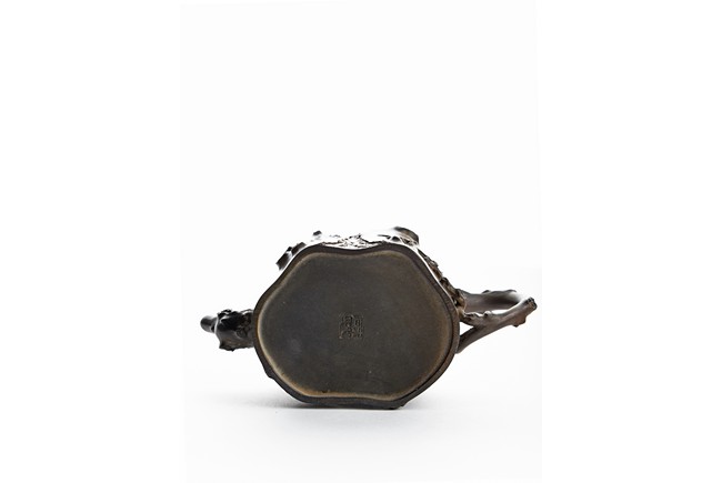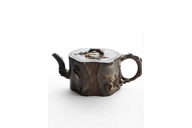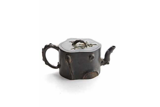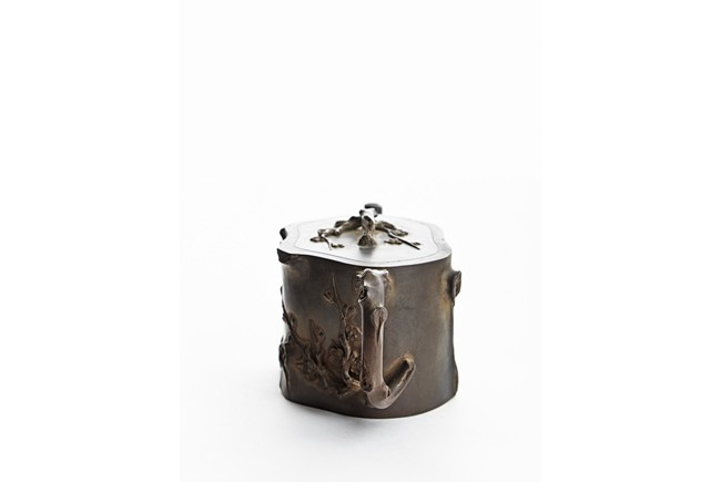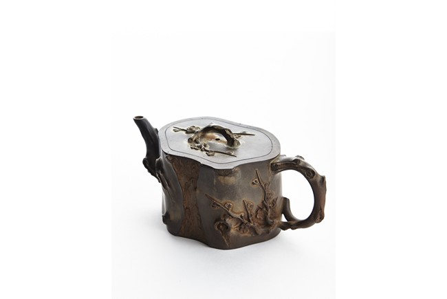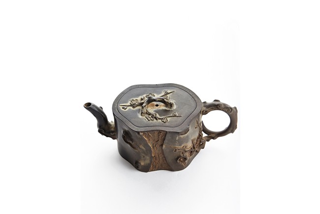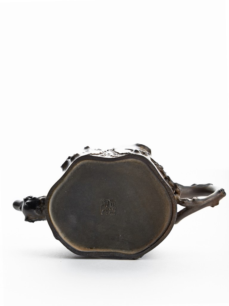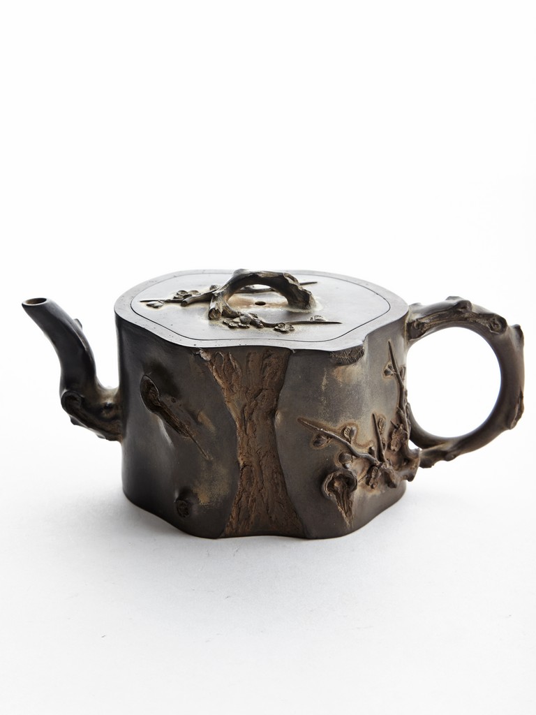 Modelled in the form of plum tree trunk, the arched handle in the form of gnarled branch, the body decorated with flowering branch in relief, the inside of cover and bottom with marks.