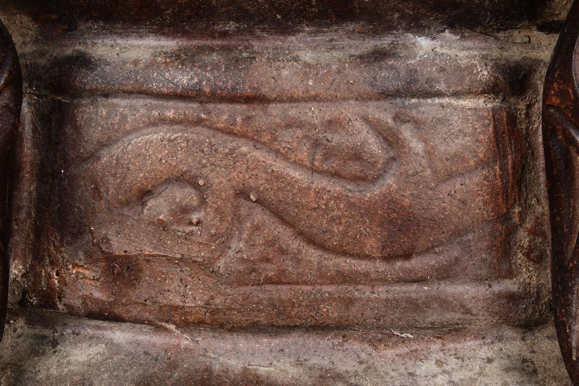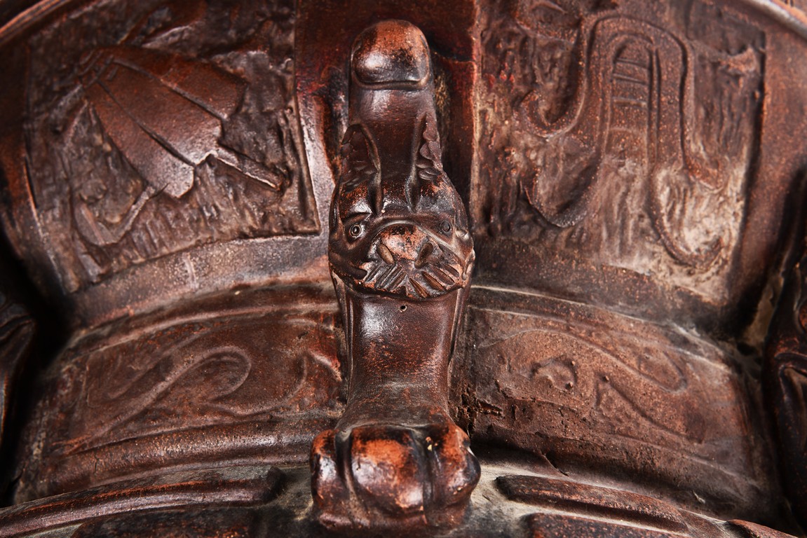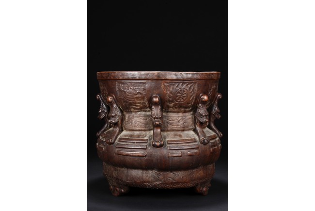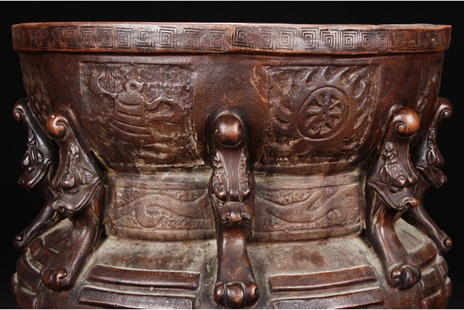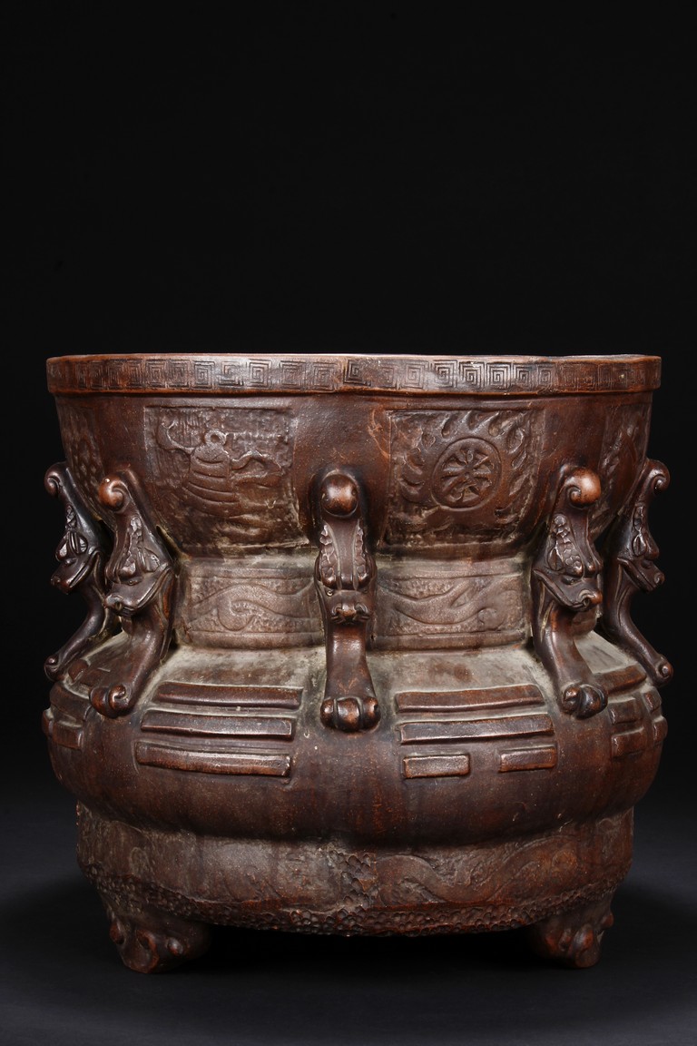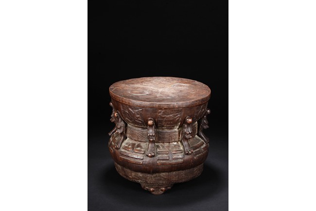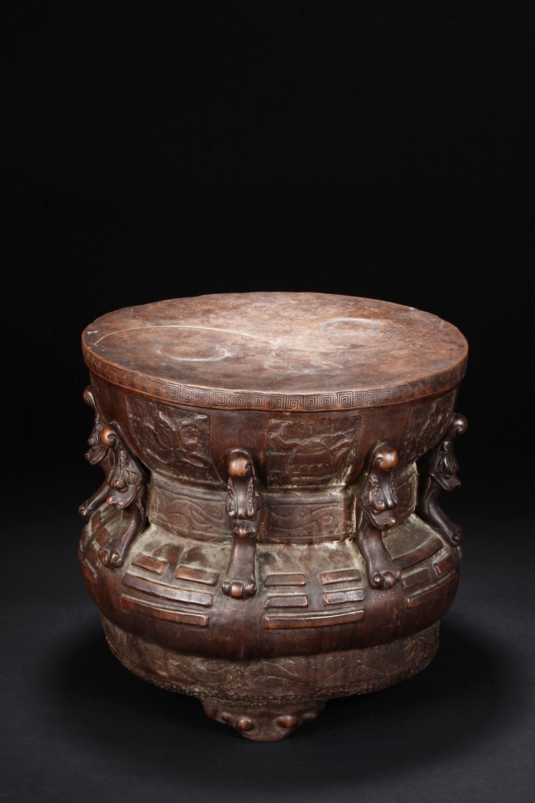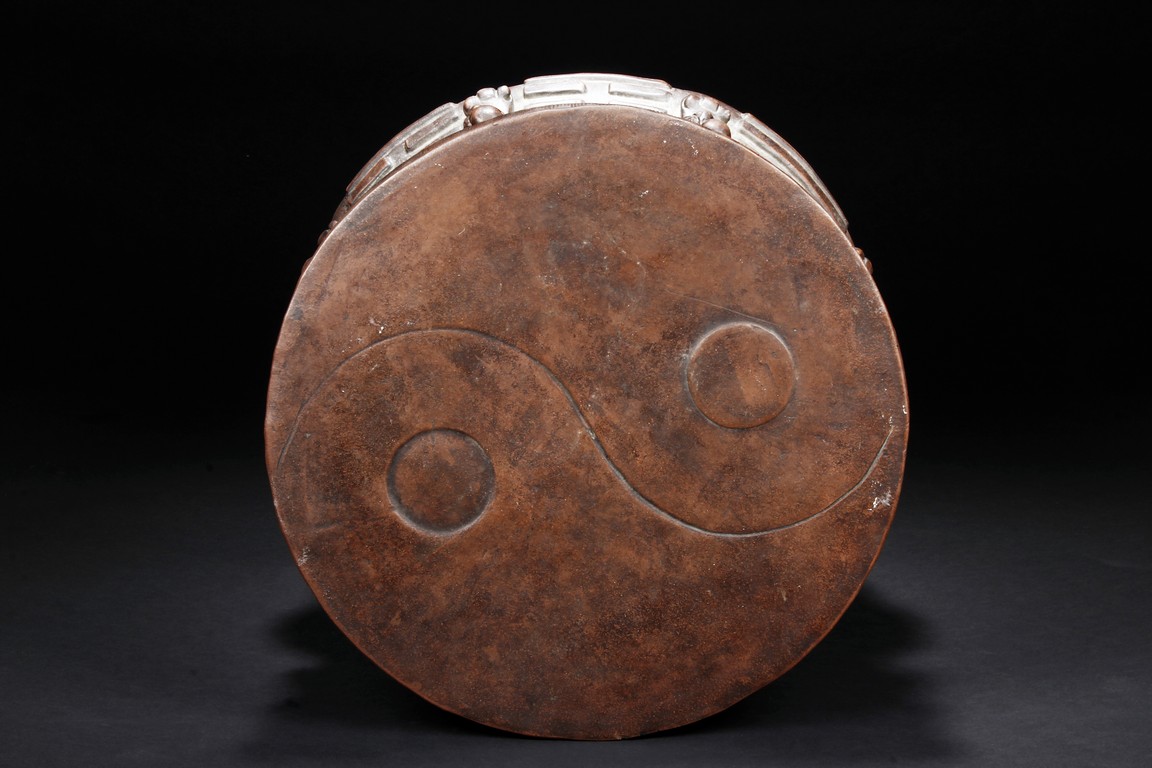 Modelled in the form of drum, this Taoist ritual apparatus is carved with a Yin-Yang motif on the top, the body carved with dragons with a hole in relief, each flanking a different Bagua motif, with a key-fret band surrounding the top, the bottom with three short ruyi shaped stub feet. Qing Dynasty Period.