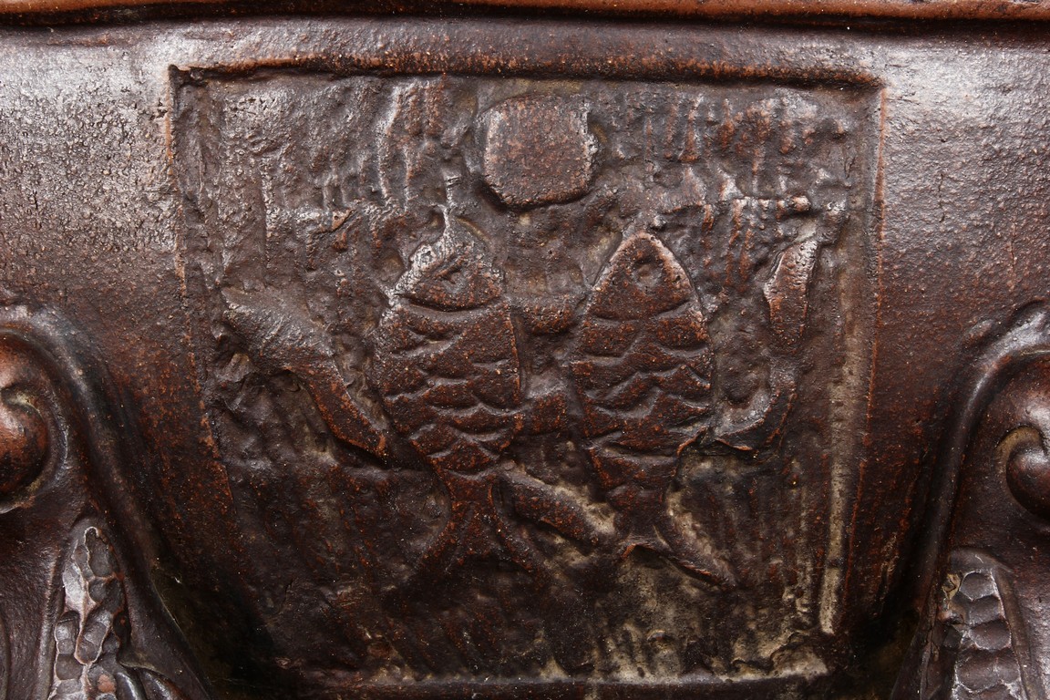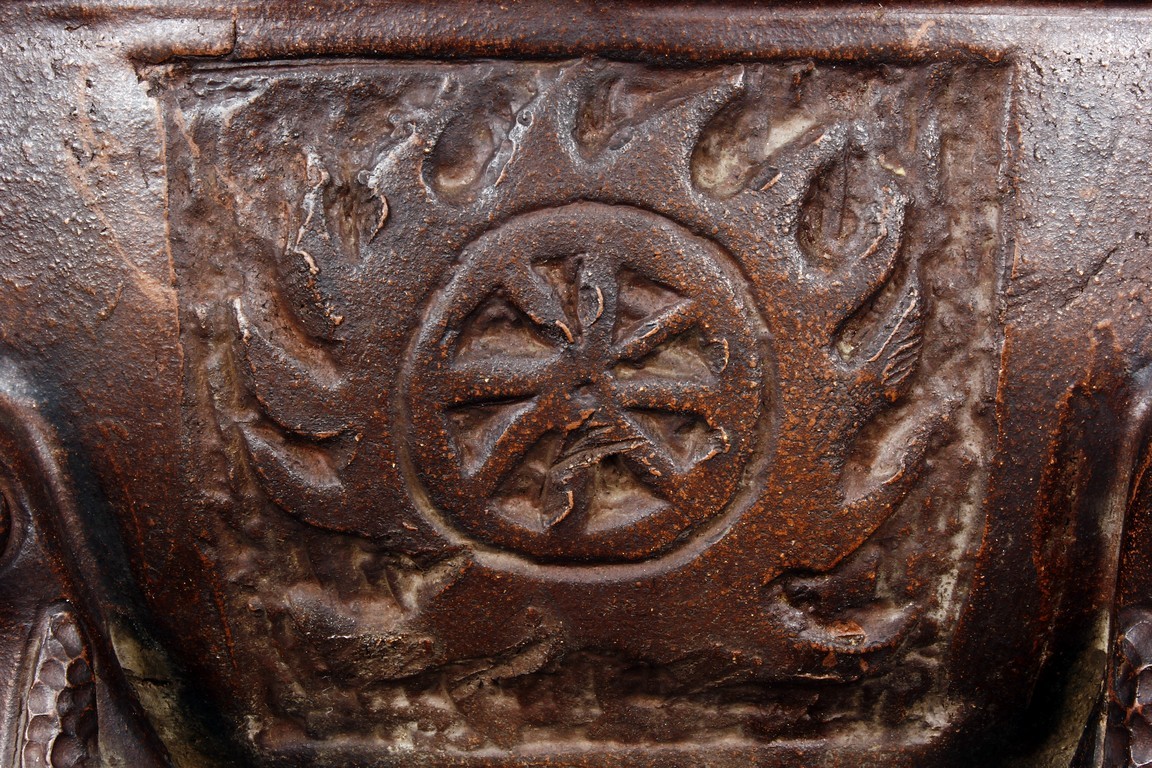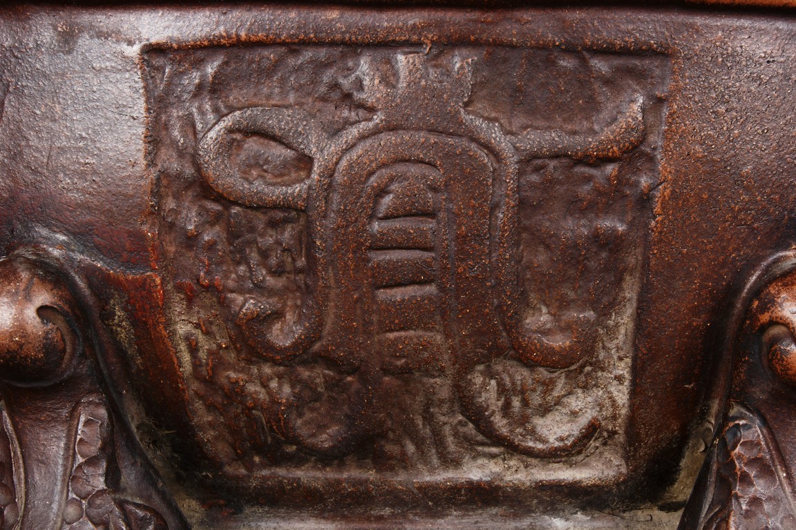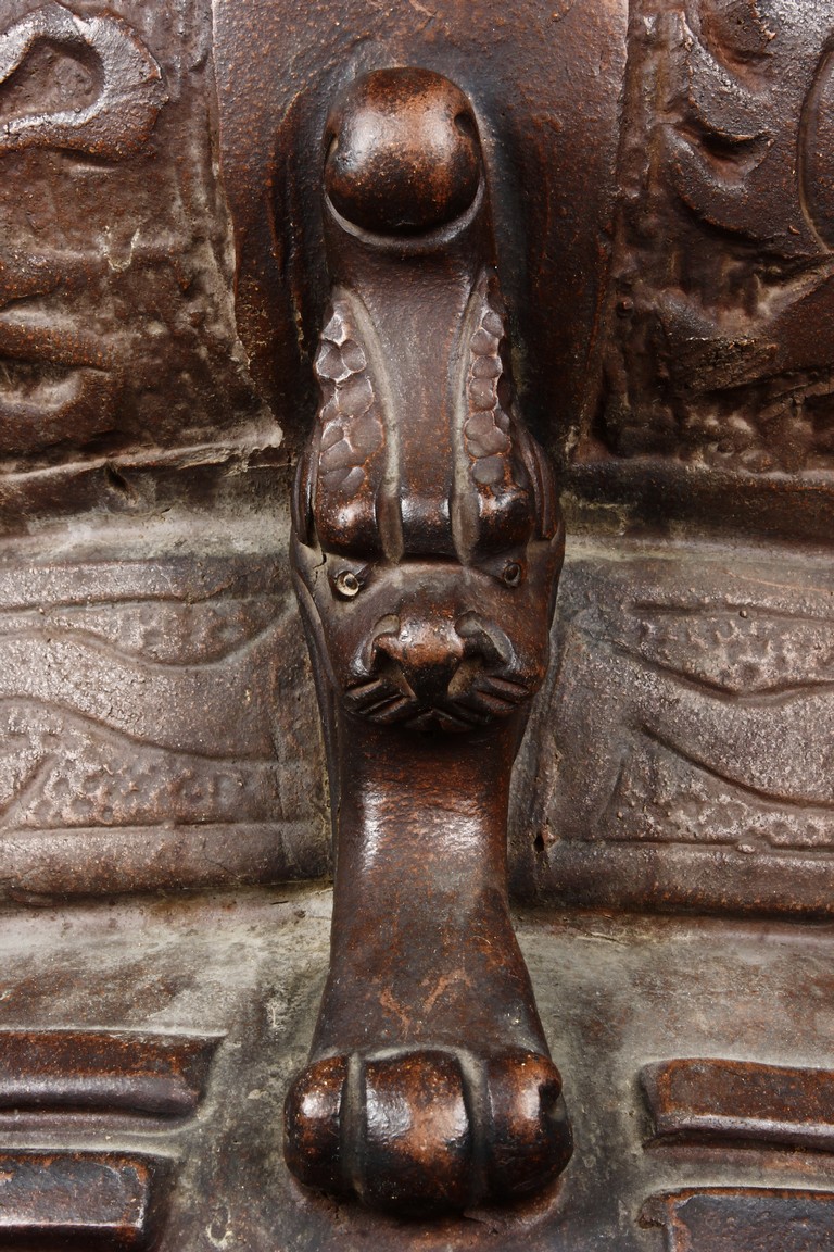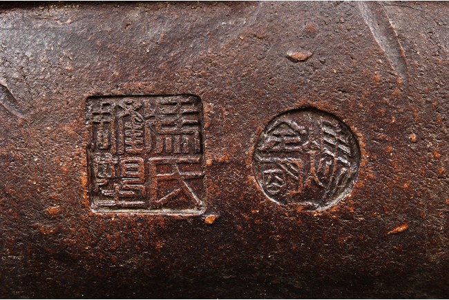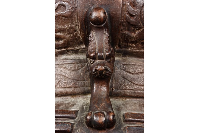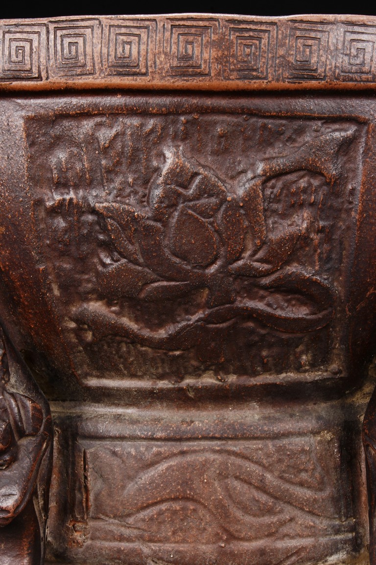 Modelled in the form of drum, this Taoist ritual apparatus is carved with a Yin-Yang motif on the top, the body carved with dragons with a hole in relief, each flanking a different Bagua motif, with a key-fret band surrounding the top, the bottom with three short ruyi shaped stub feet. Qing Dynasty Period.