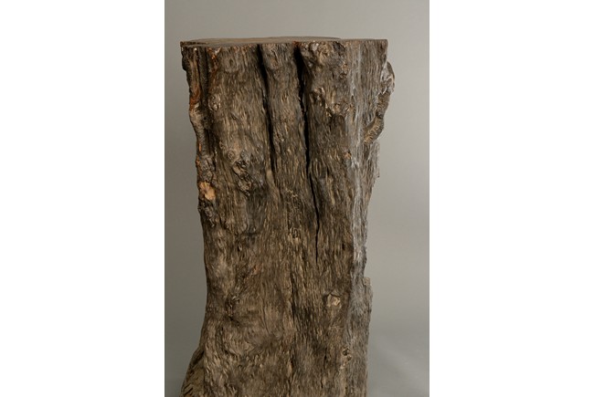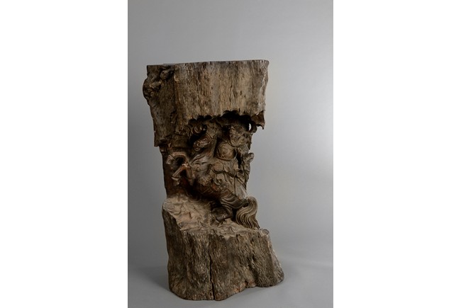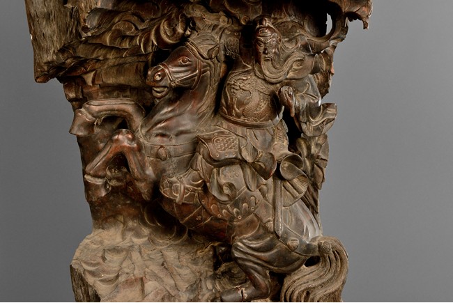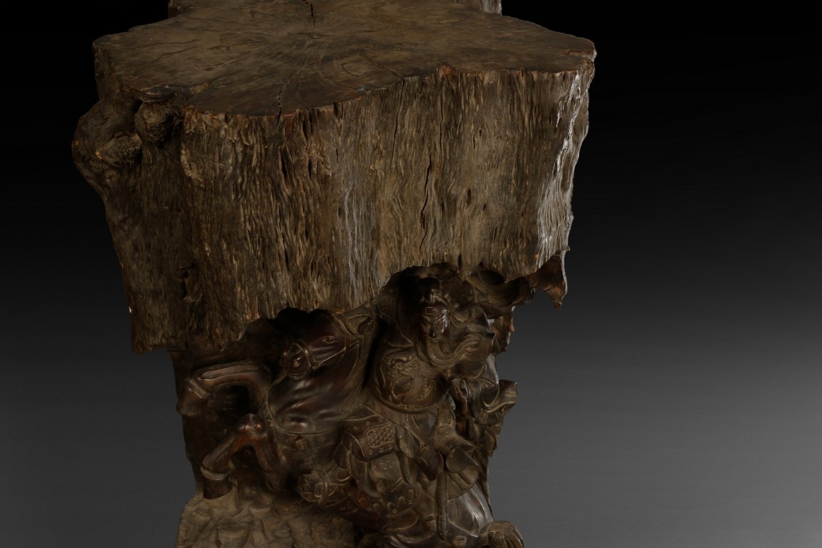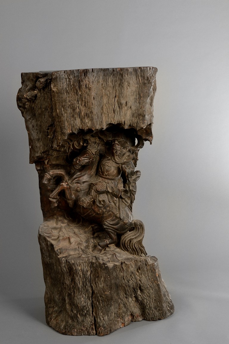 This solid trunk of Zitan wood is carved in recess with a fully armored Guandi riding on a galloping horse on a mountain path. The Guangong figure is highly detailed with vivid expression and elaborately decorated armor. Qing Dynasty period. 此紫檀原木雕關公像擺件,器型大,所用材料天然厚重,所雕人物古樸生動,立體感強,稀罕