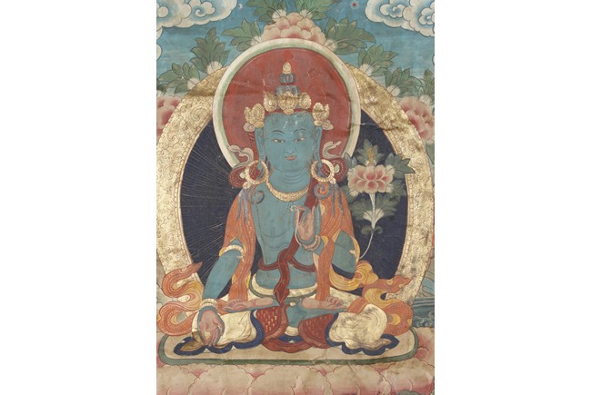 Set in a mountainous landscape, This thangka is painted on cloth depicting Akshobhya seated in dhyanasana on a lotus base against the ivory colored mandorla. He wears a loose robe revealing chest and necklace. His face is painted with serene expression flanked by a pendulous earlobes pierced with earring. Qing Dynasty Period.