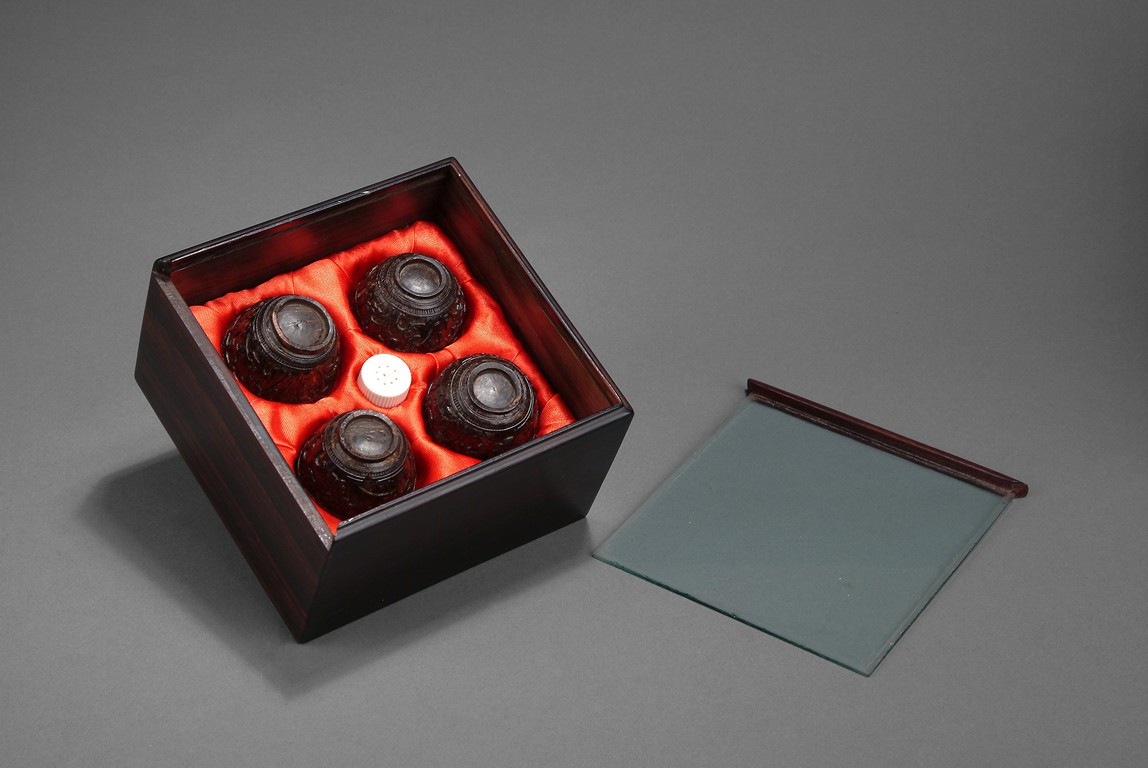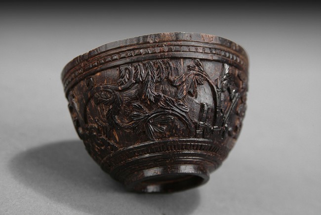 Intricately carved, the wine cups made from coconut shells, with exterior carved in low relief of bamboo, trees, and flowers. Age related wear and slight damage. Qing Dynasty period.