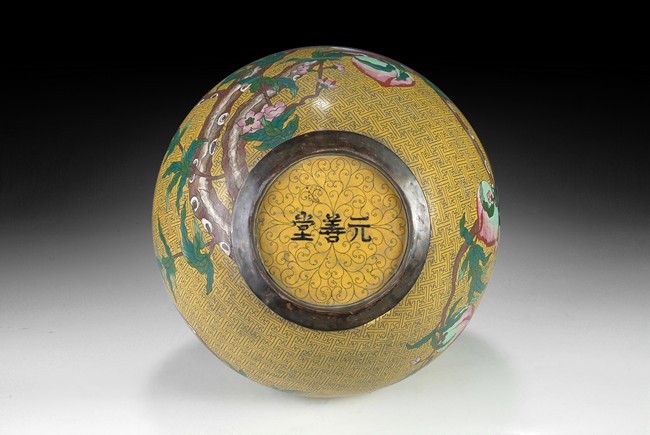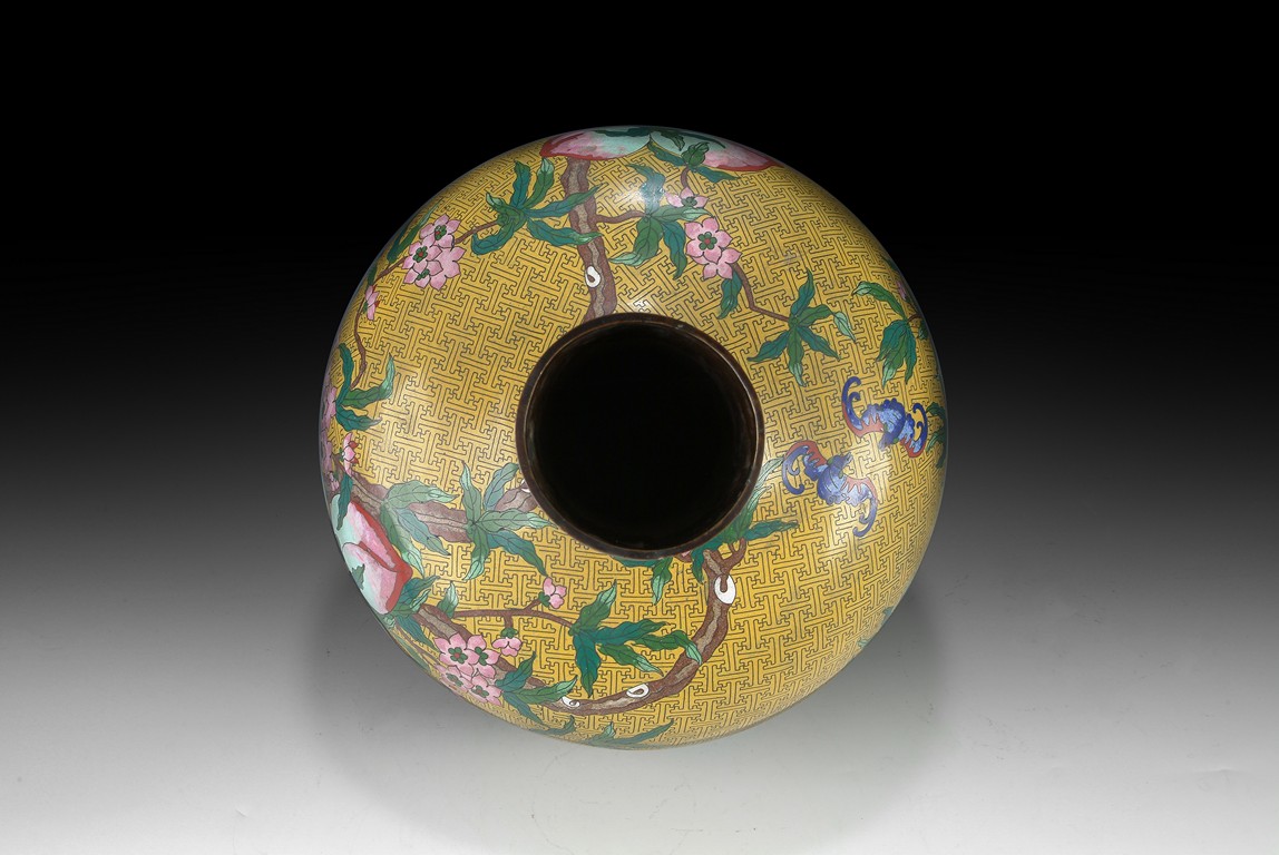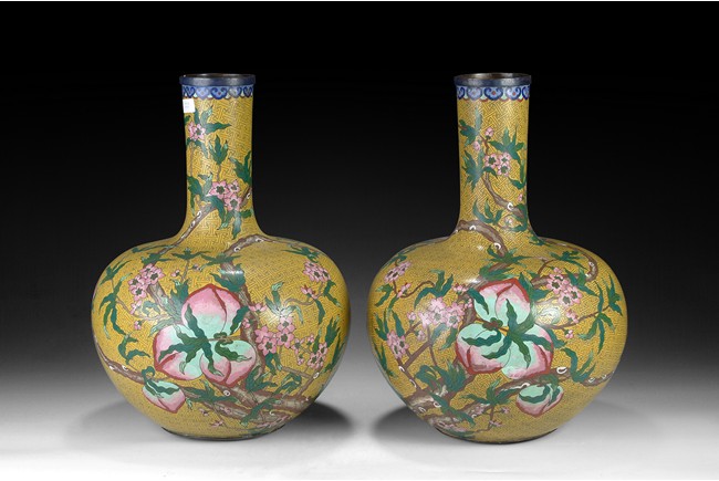 This pair of large cloisonne enamel vases each has globular body with long neck, the whole body decorated with flowering peach branches and flying bats. The mouth is bordered with a band of Ruyi patterns. The bottom bears a three character mark. Late Qing Dynasty period.