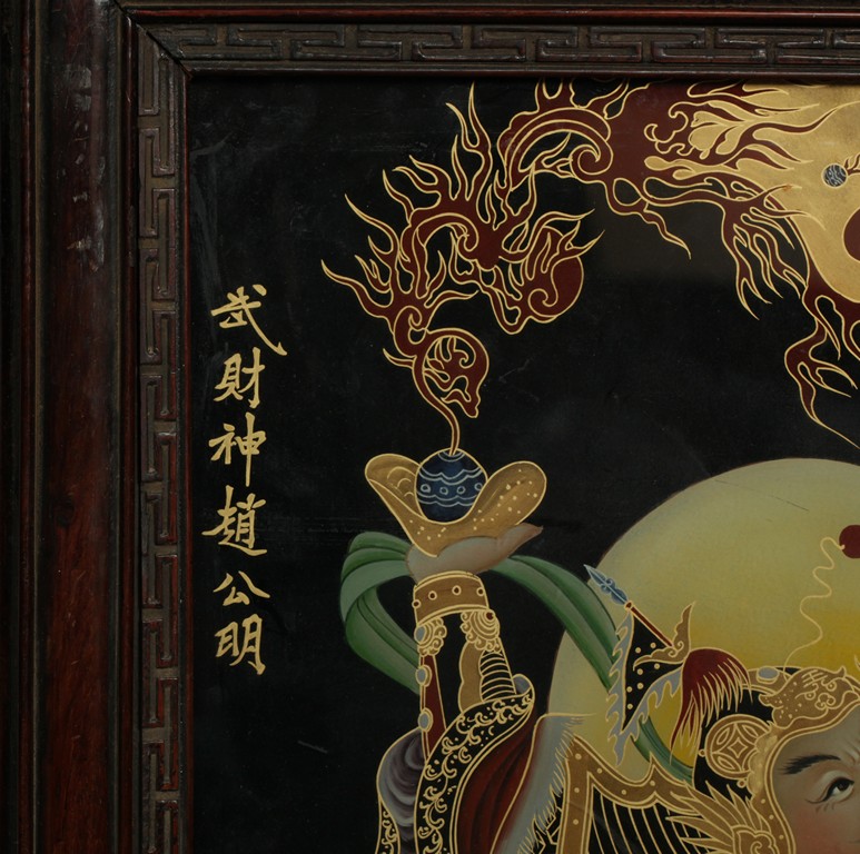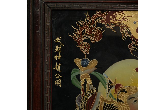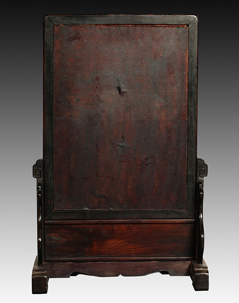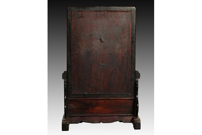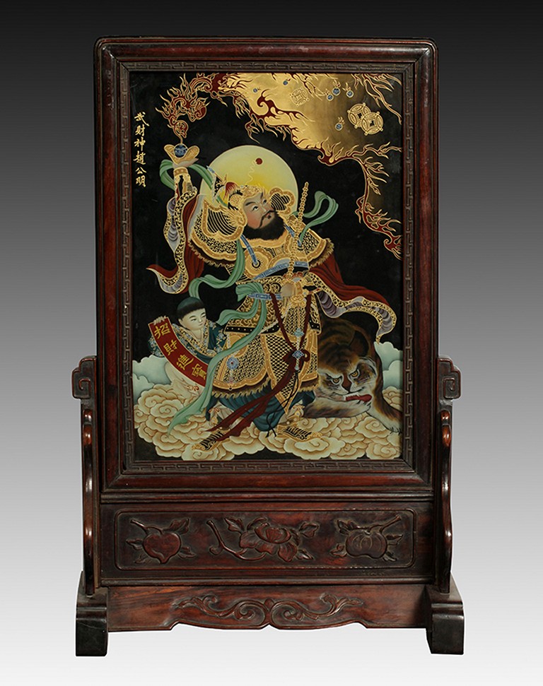 The table screen depicts the Chinese God of Prosperity bringing fortune. The colored glaze features beautiful and detailed colors, while the low relief carved hardwood frame and stand features delicate patterns.
