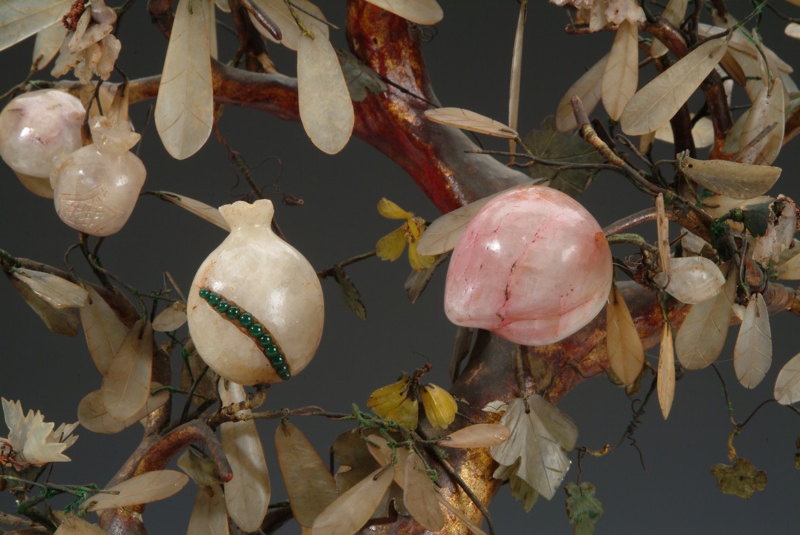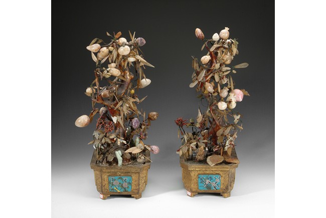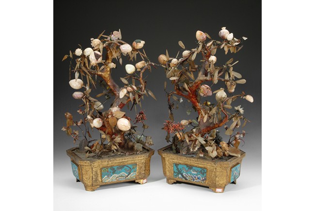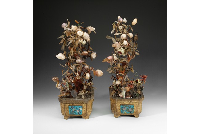 Each fruiting and flowering tree issuing from a rectangular gilt-metal jardiniere with canted corners, raised on four bracket feet, decorated with scrolling foliage, the front and back set with cloisonne panels featuring three sheep, the narrow sides set with panels depicting flowers, one tree laden with pomegranates, some highlighted with hardstone seeds, the other with peaches, their trunks entwined with a flowering vine and surrounded by flowering plants, and small images of sages and theirattendants. Qing Dynasty period.