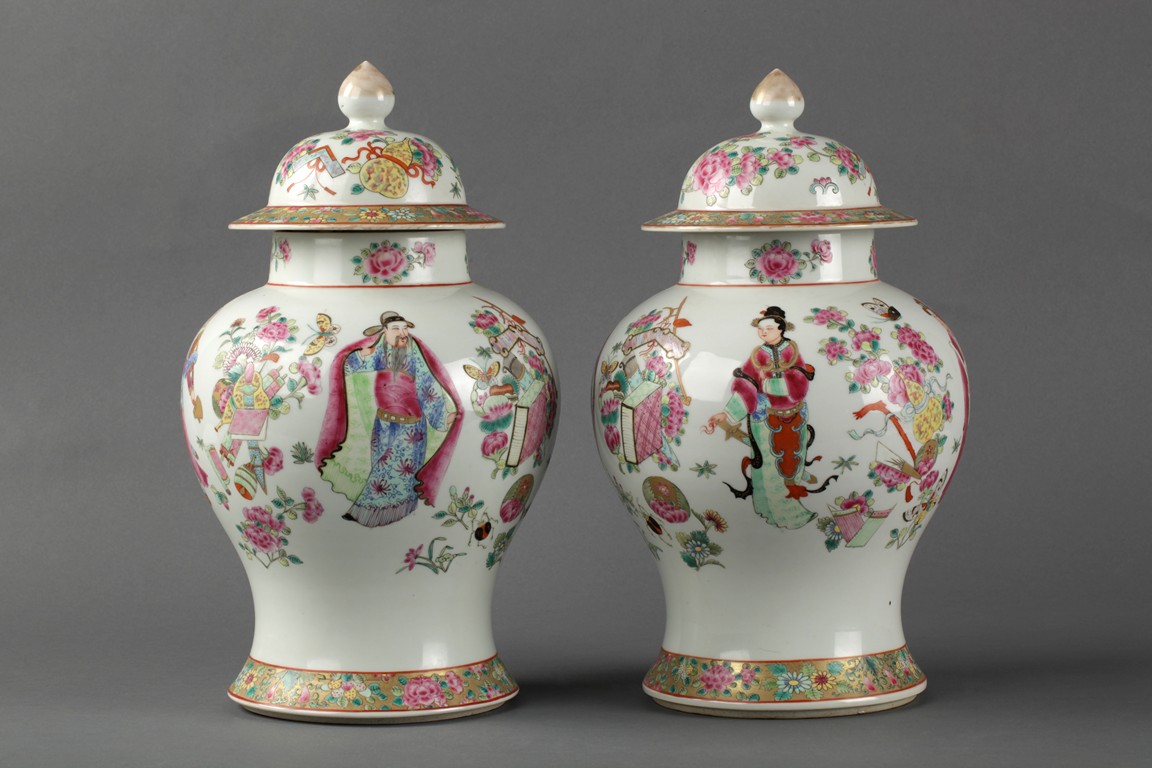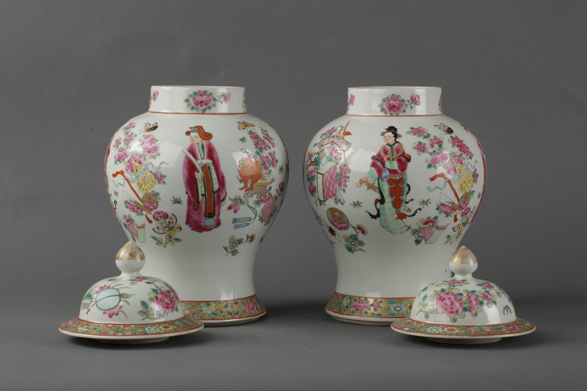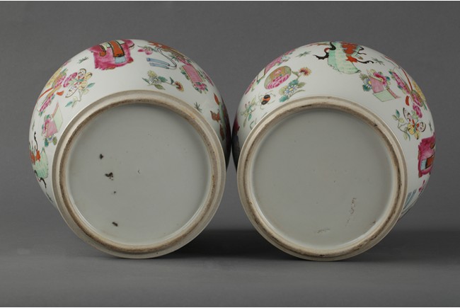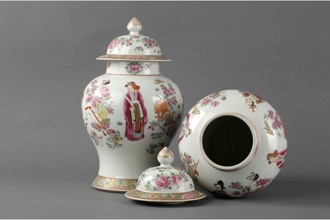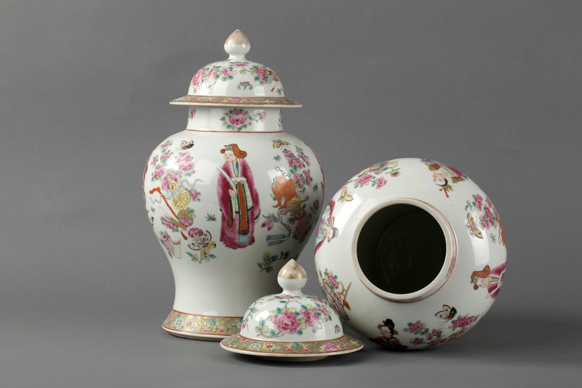 200The jars were painted with four different figure, peony flowers, butterflies, items symbolizing luck, and flower band patterns.