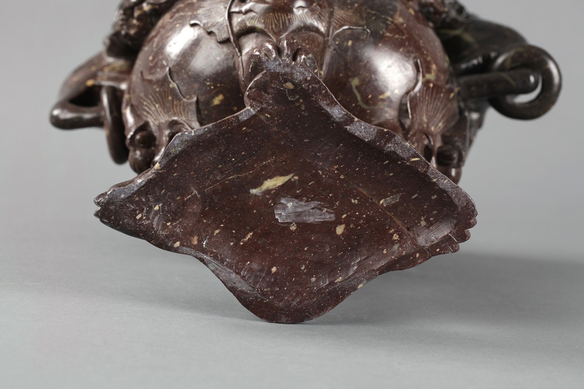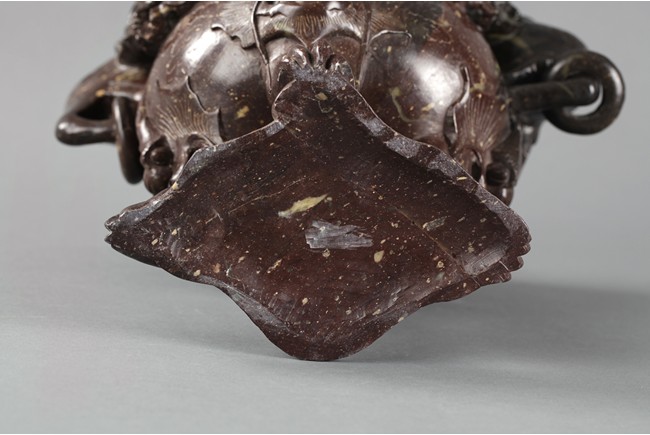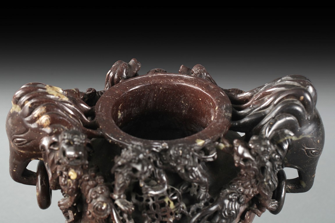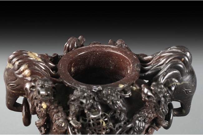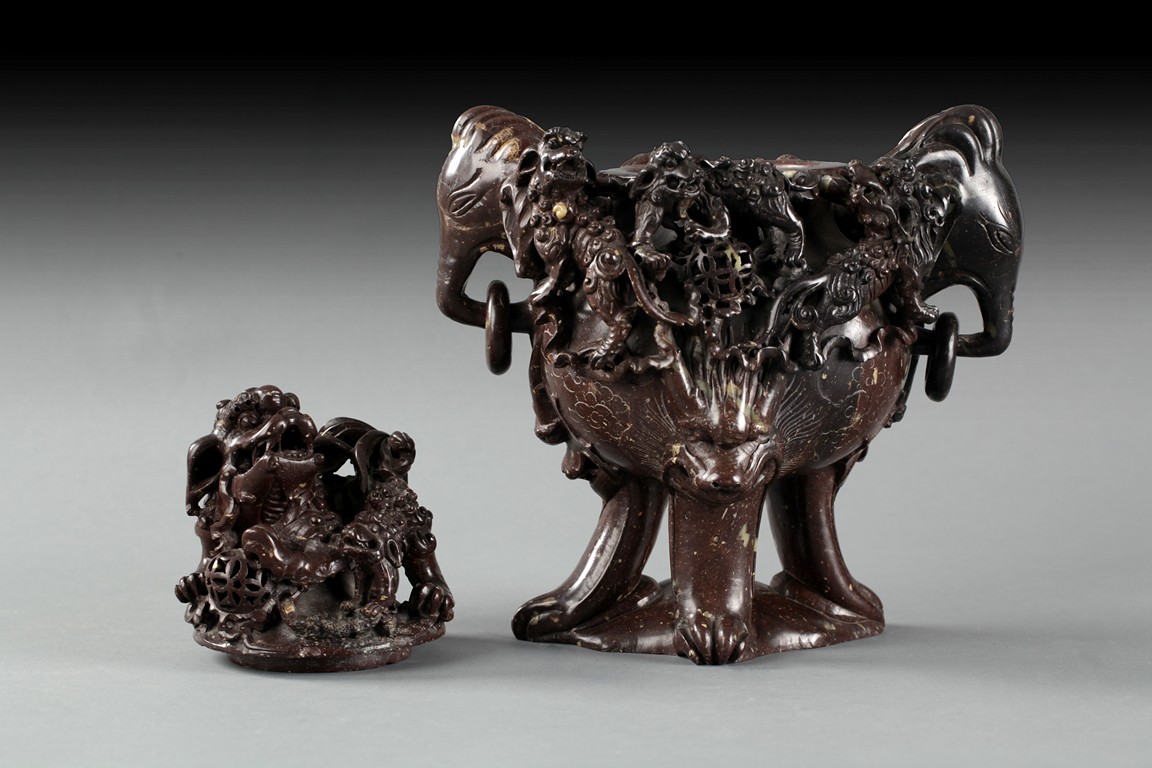 The Qingtian stone carved censer is composed of many different beasts, including dragon masks with beast feet stand, elephant head handles with rings, Chilong climbing near the body, and a mythical beast on the very top of the cover. Cloud patterns and fortune patterns engraved on rest of the censer.