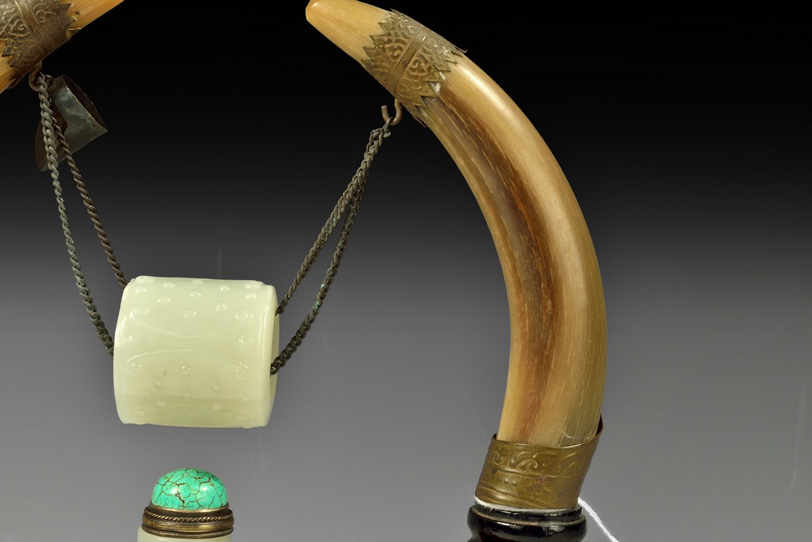 The table decoration consists of a pair of small horns, set up to hold a jade thumb ring, with a jade snuff bottle in the center. The thumb ring has dotted patterns, while the jade snuff bottle has a turquoise stopper. Horn L: 5 in (13 cm)