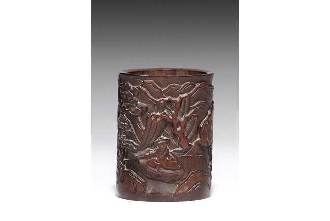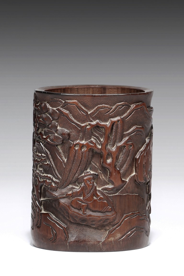 The exterior is carved in openwork showing an old man seated next to pine trees fishing in a river amongst rocks and mountains. The opposite side is carved with a wandering deer amidst mountain. The brush pot is of cylindrical in shape. Late Qing Dynasty Period.