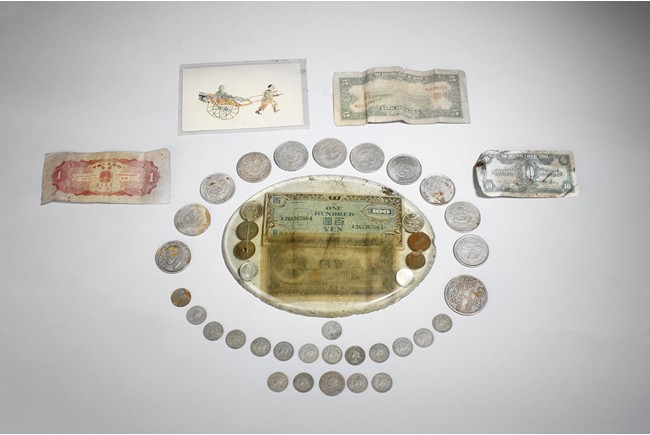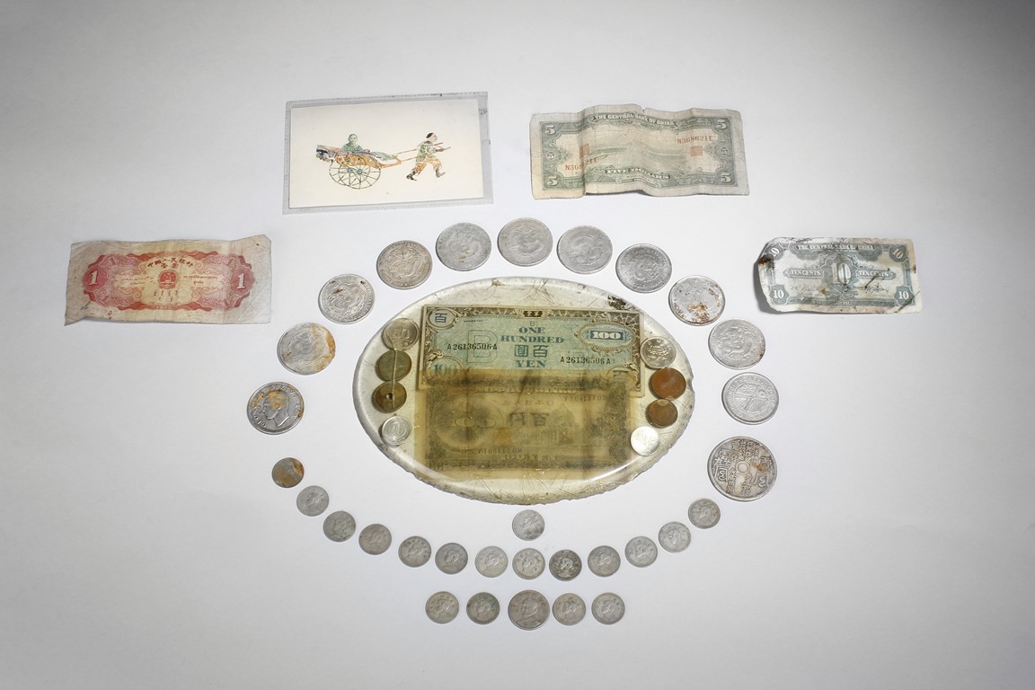 The group includes 38 vintage coins, most of which from the Chinese Republic period, and five vintage paper currency from China and Japan. A Republic period post card is also included.
