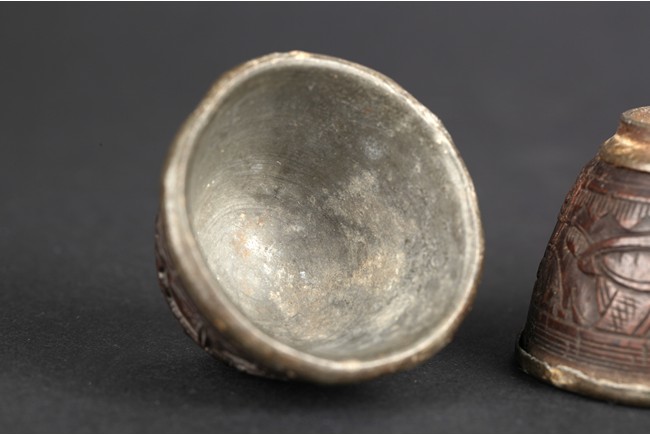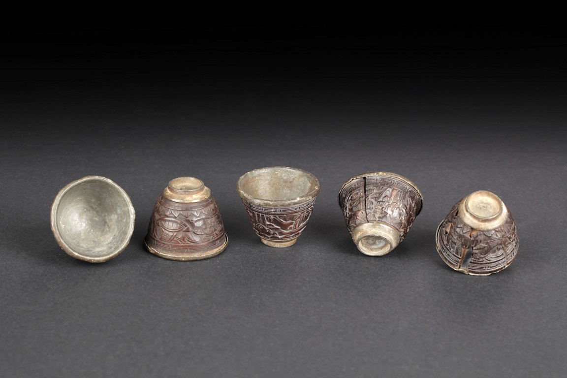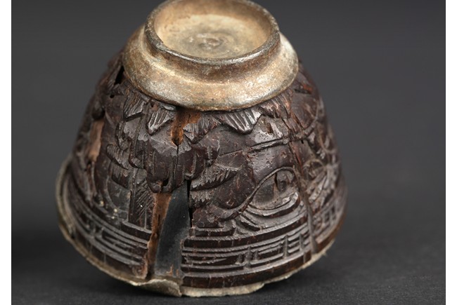 Each cup's exterior carved with tropical landscape scene, beneath compressed key-fret pattern, the rim, interior, and bottom enclosed in metal. Age related wear and cracks. 18th century.