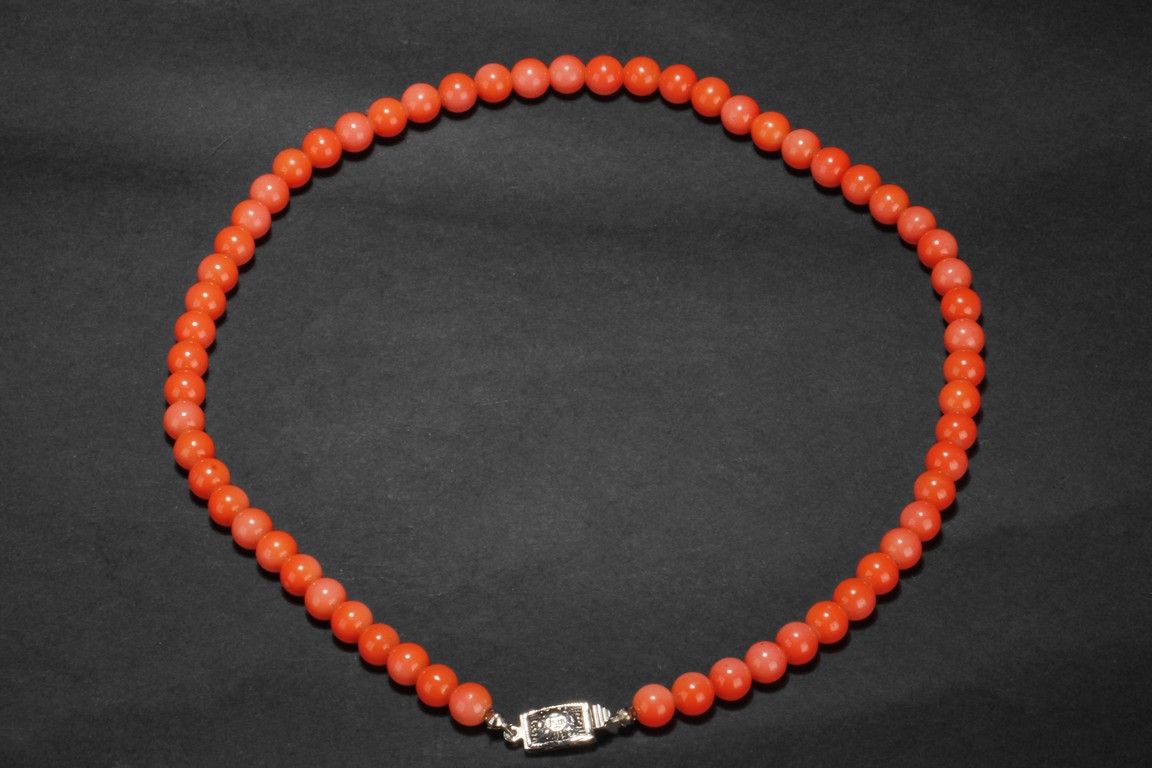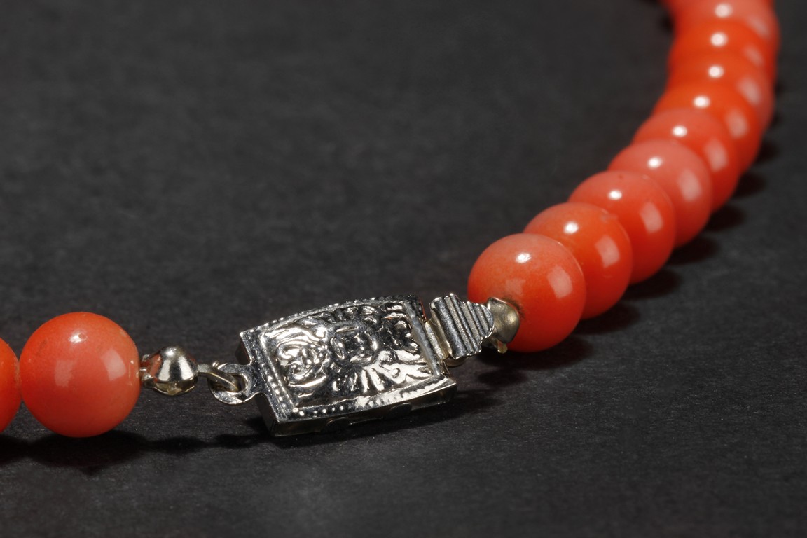 The red bead necklace consists of 60 similar sized beads, and may be coral.