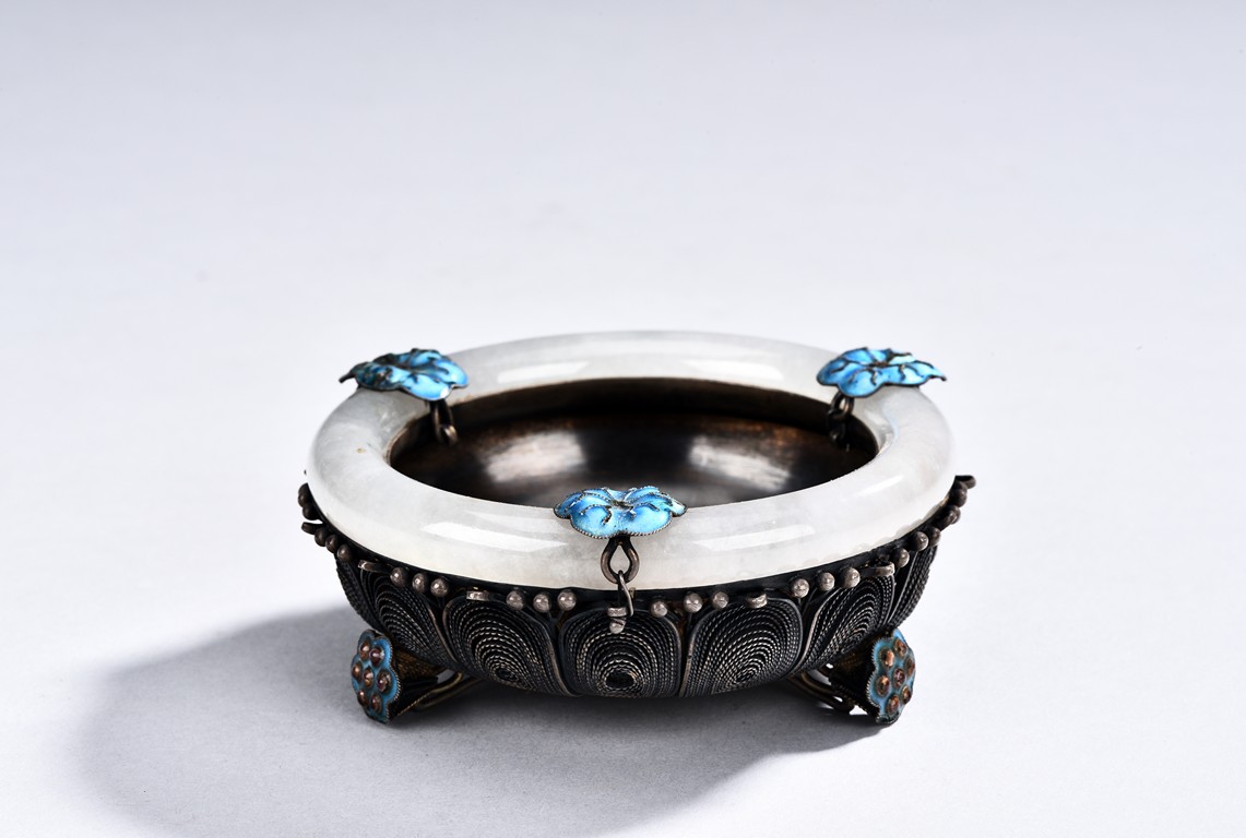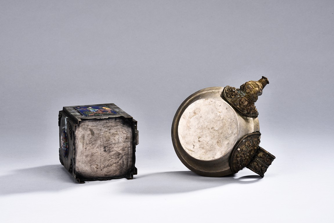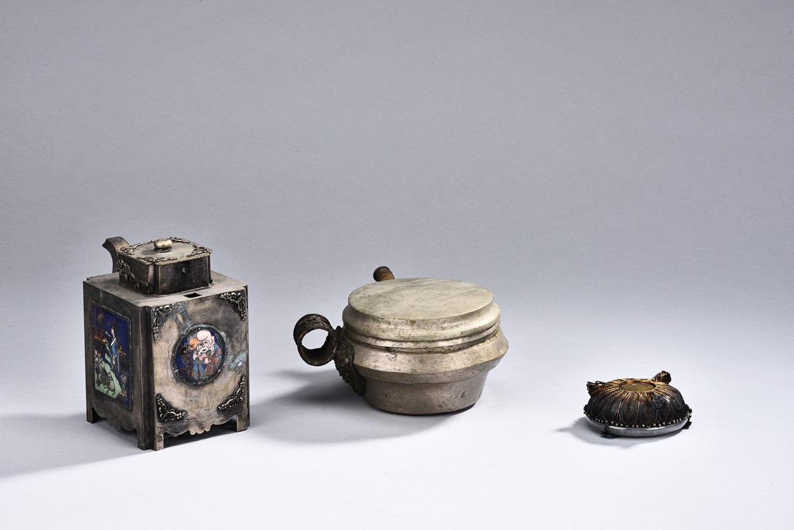 Including an silver ewer of rectangular section, the body decorated with scenes of beauty and shoulao in cloisonne enamel, the bottom etched with two character 'Wen Yin'; and a circular shaped silver bowl inset with bangle, the bottom with a silver mark; and a silver or silver-like ewer with a circular cover, the loop handle and spout with decoration in relief.