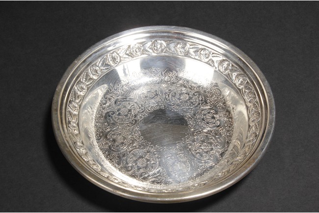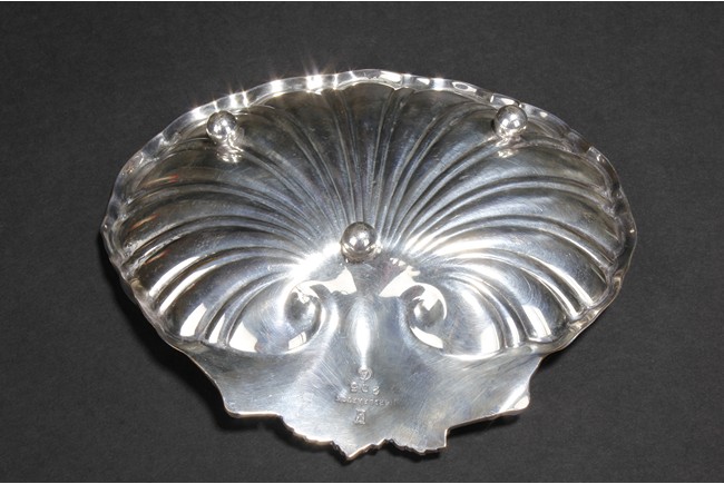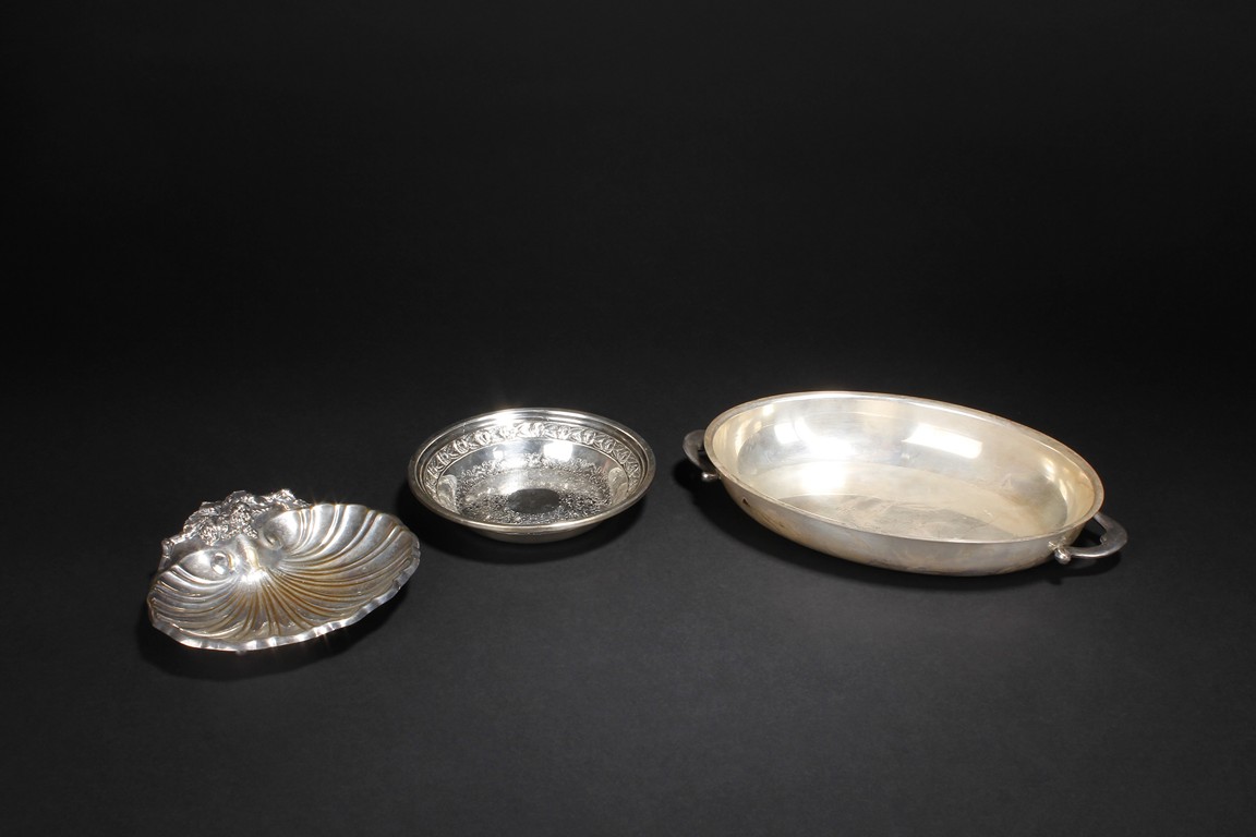 Three silver dish made by Reed & Barton, the larger one has two handles, a smaller dish in shell form, and a round and incised small dish.