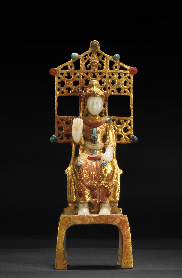A Southern Asian style of gild jade inlaid 'Guanyin' seated in her throne chair.