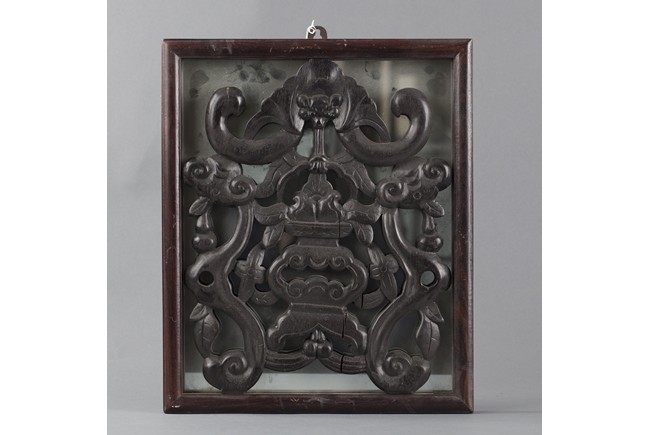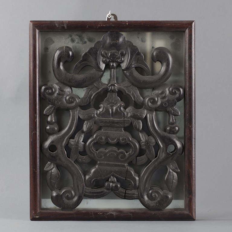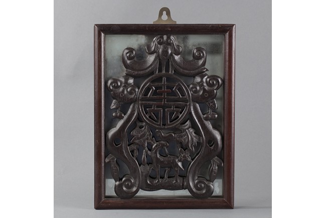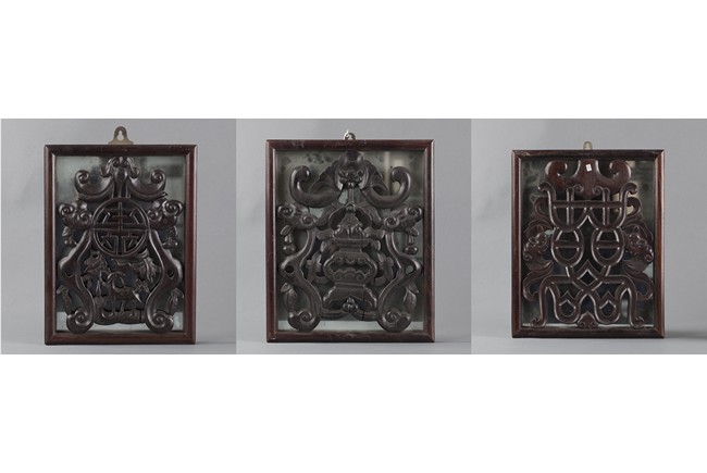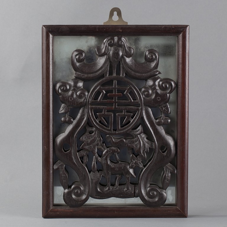 The three wood frames have have mirror inset in the back, with different wood carved themes in the front, such as Chinese character with bats, flower and vines, and Lingzhi and deer.