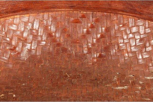 Two Chinese bamboo stitched baskets, one similar to a bowl shape, and the other is of long cylindrical shape.