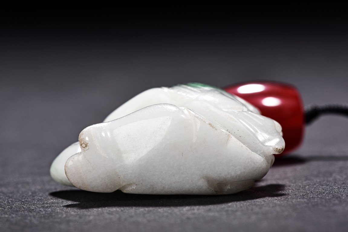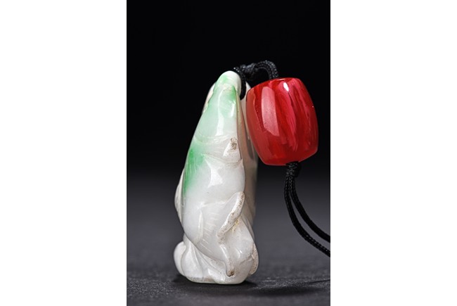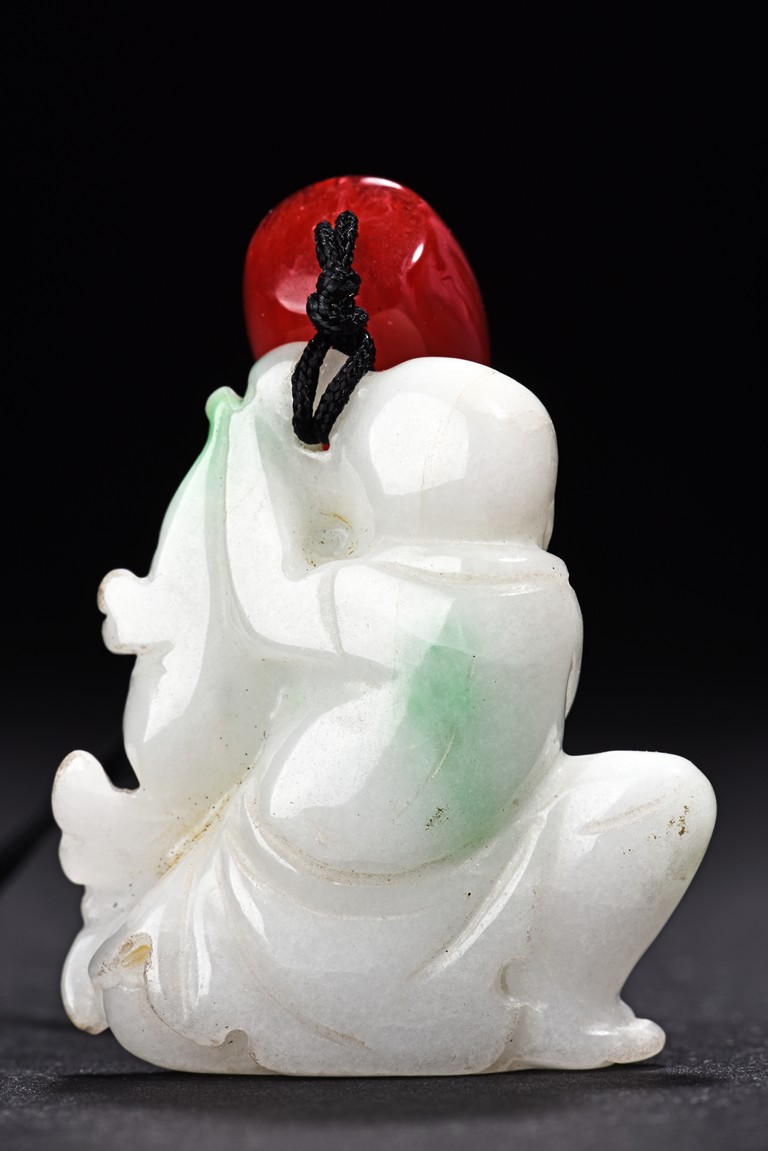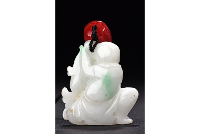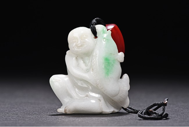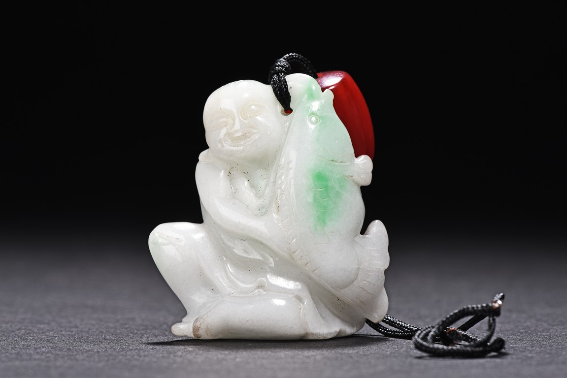 A JADEITE PENDANT OF BOY AND FISH 翡翠童子抱魚掛墜