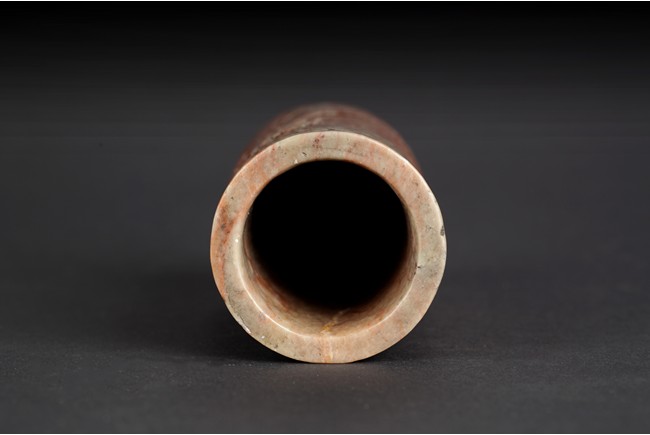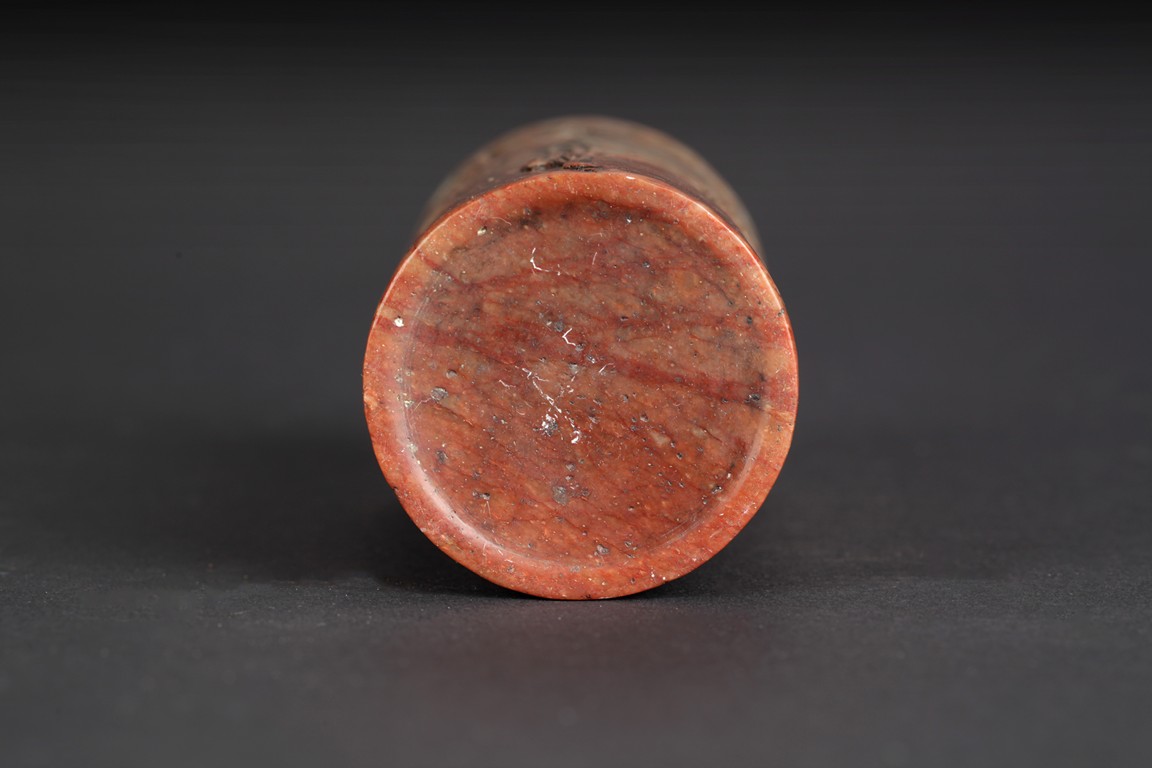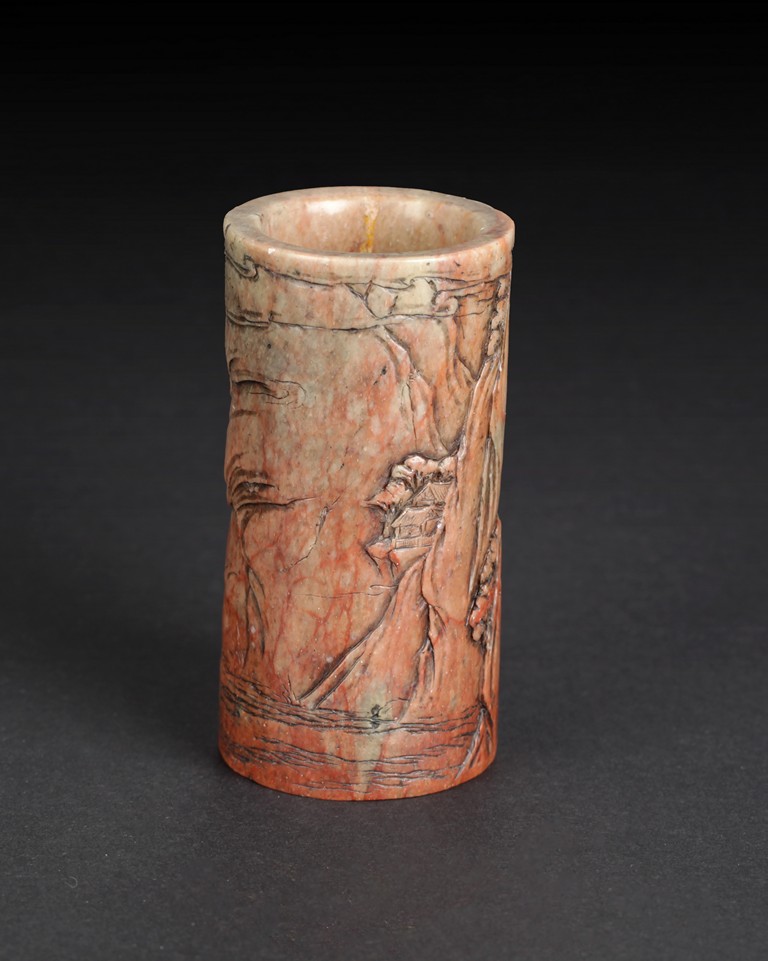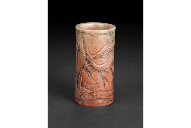 Of cylindrical shape, the brush pot carved with two elders and a young boy meeting in mountain setting, with rivers, trees, and pavillions nearby.