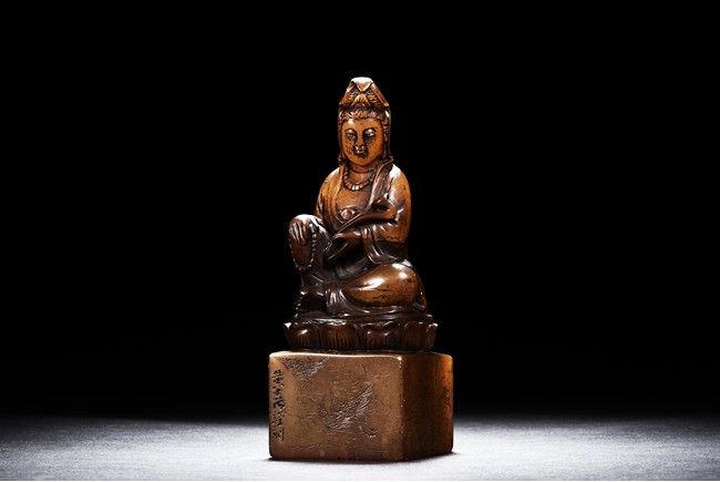 The figure is carved seated on lotus throne, with one hand holding a ruyi and one hand holding a necklace, the bottom seal inscribed with author's colophone and crane motif.