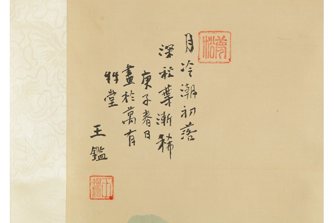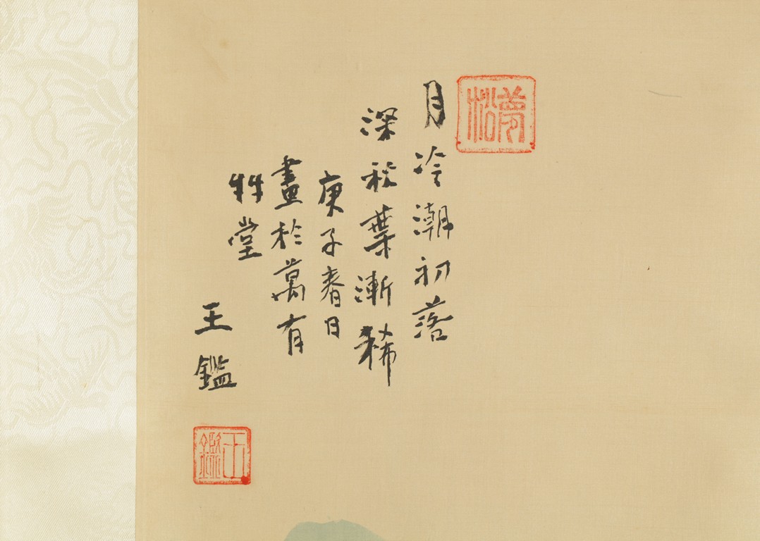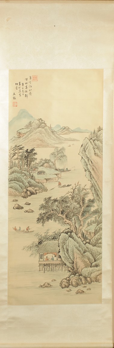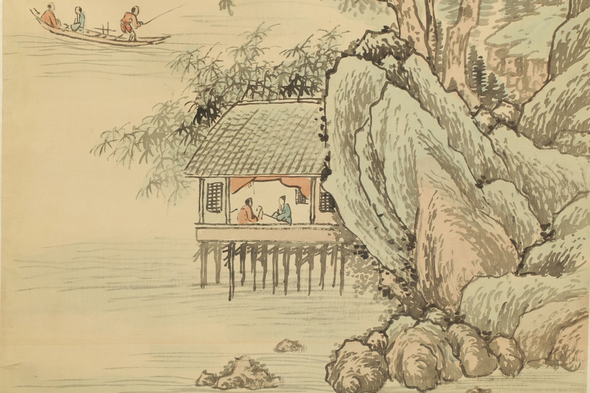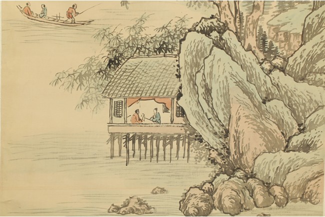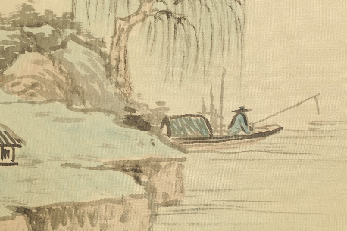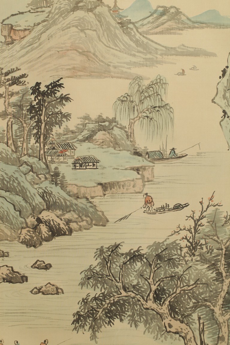 A beautiful landscape scene with intricate details such as mountains, rivers, pine trees, fishermen, and a small cottage with two figures inside. Colophon and artist seal on the upper left corner.