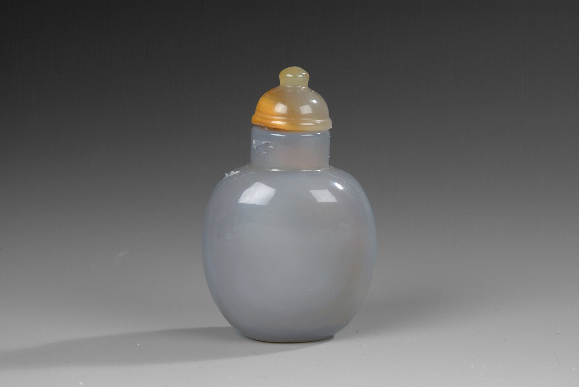 Of rounded, ovoid form and finely carved on one side with a delicate gold fish over the russet, the agate stone of pale mottled lavender color with a soft polish. Capped with agate stopper with russet. Missing spoon. Republic period.