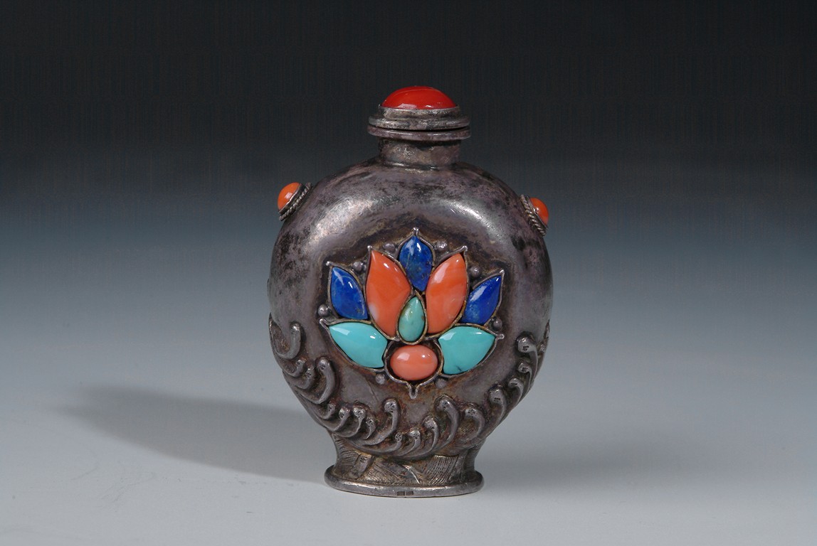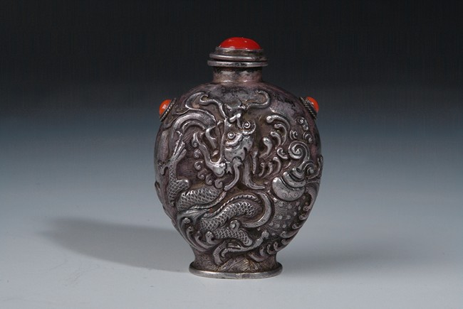 This silver snuff bottle was sculpted with a four clawed dragon on one side, and a lotus flower embellished with gemstones such as coral, turquoise, and lapis lazuli on the other side. The body was also decorated with two coral beads, and the bottle is completed with a coral stopper.