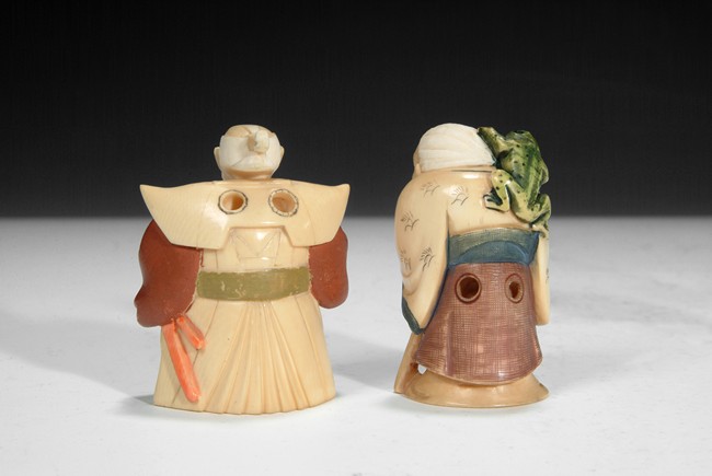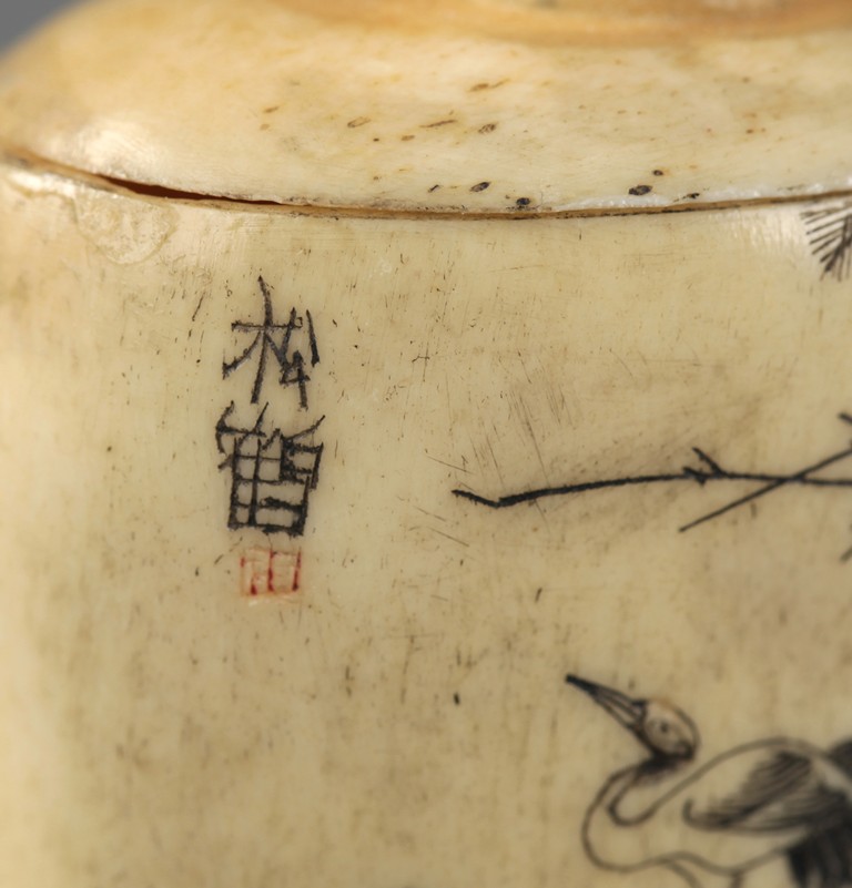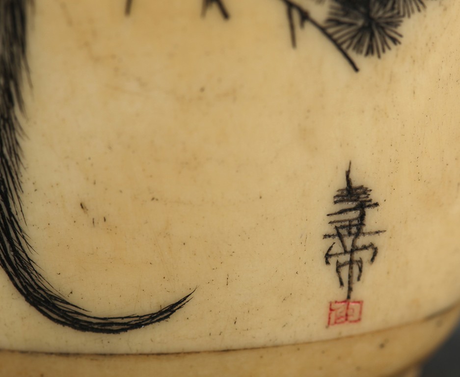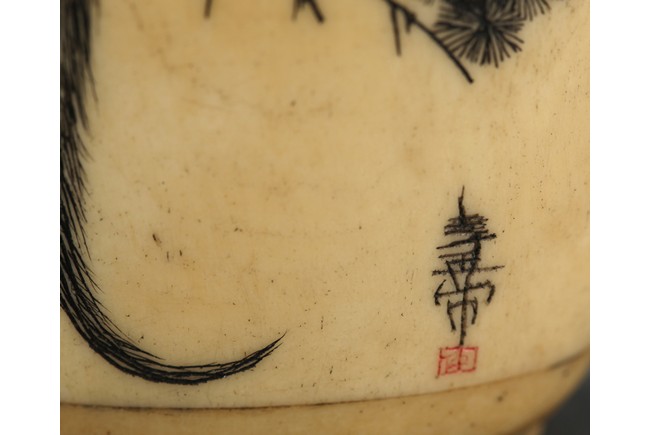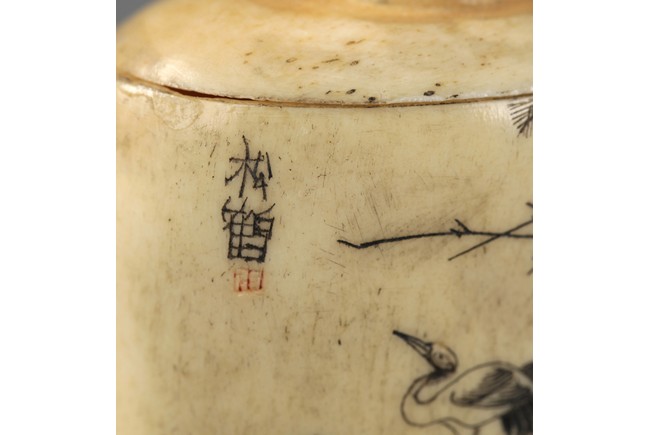 "The group of items include a bone carved figure ""Father and child"", a bone carved stamp, a set of bone carved figures, a bone carved snuff bottle, and a bone carved elephant."