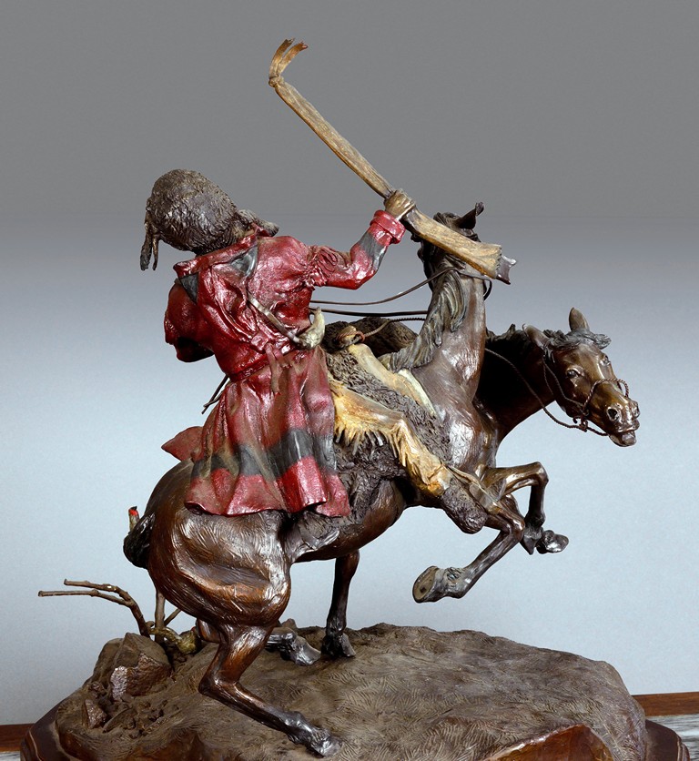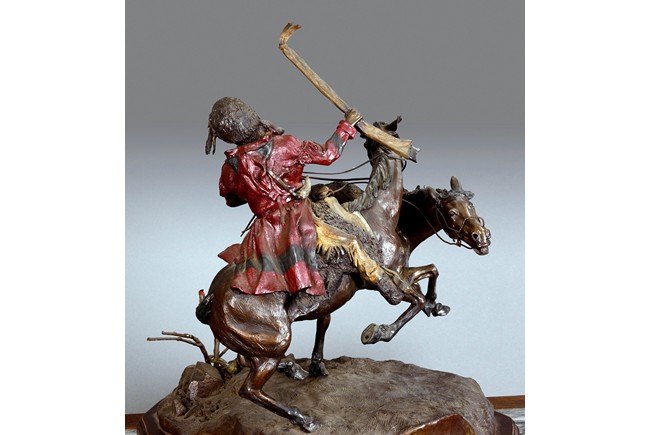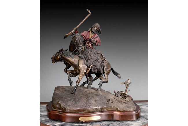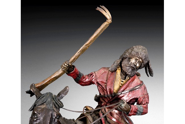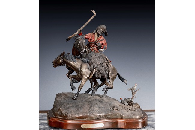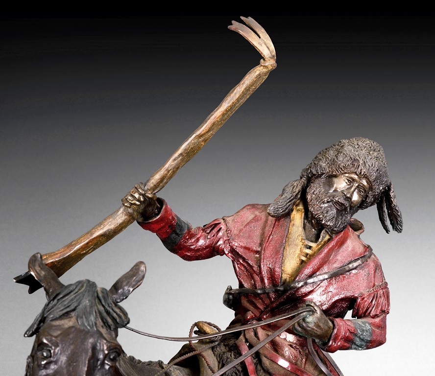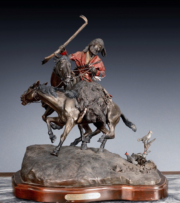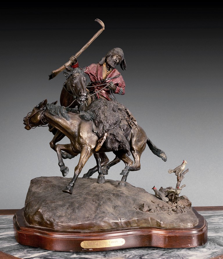 A cast bronze statue group consisting of a hunter on his back and another horse carrying the goods. It is completed with a wood base, which bears a plaque signifying the artist name Gerry Metz, and title of the sculpture as 'Troublesome Covey'.