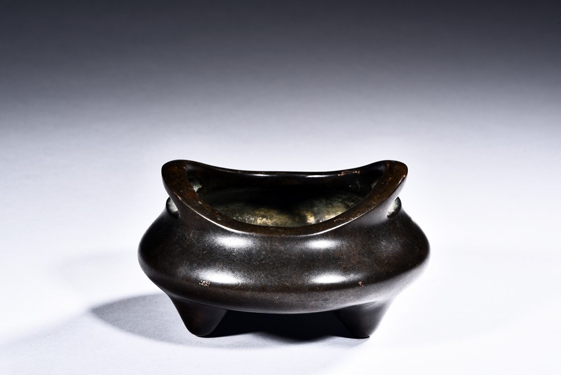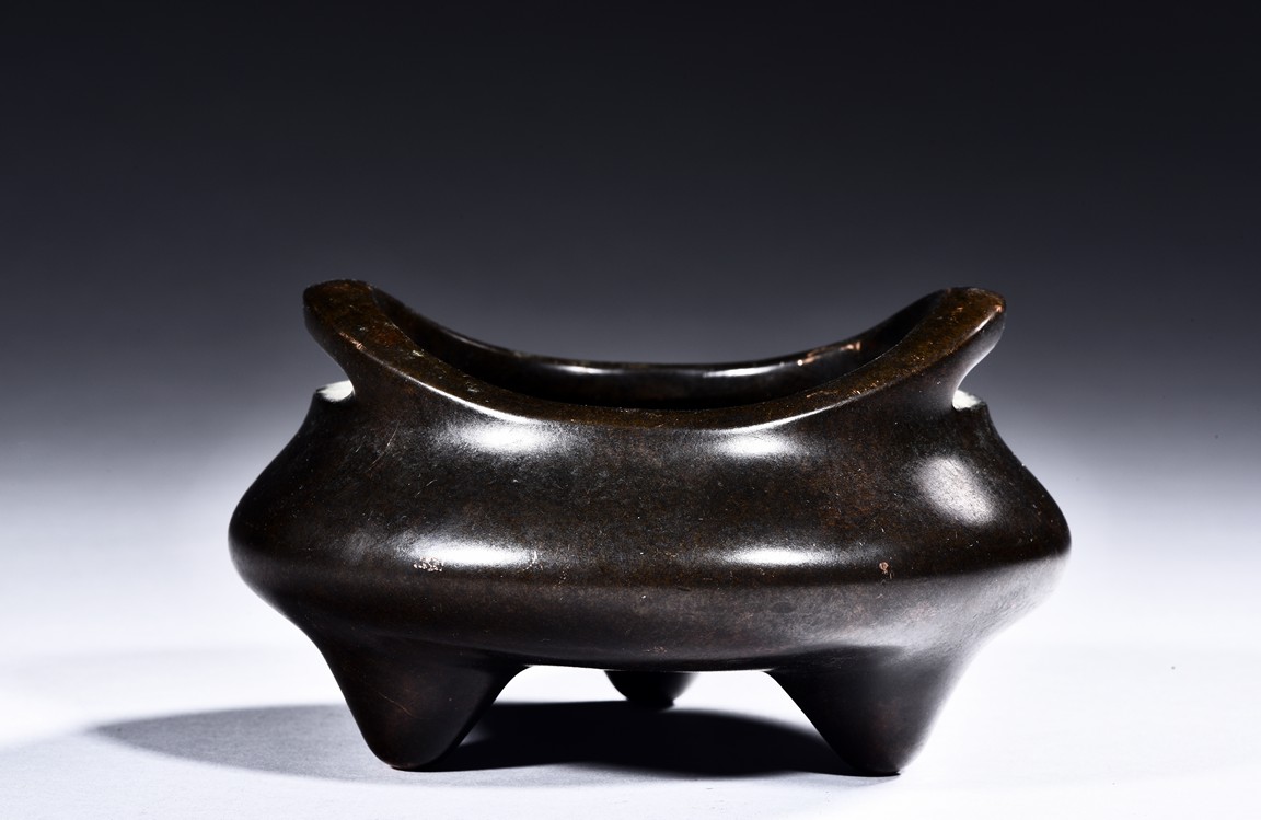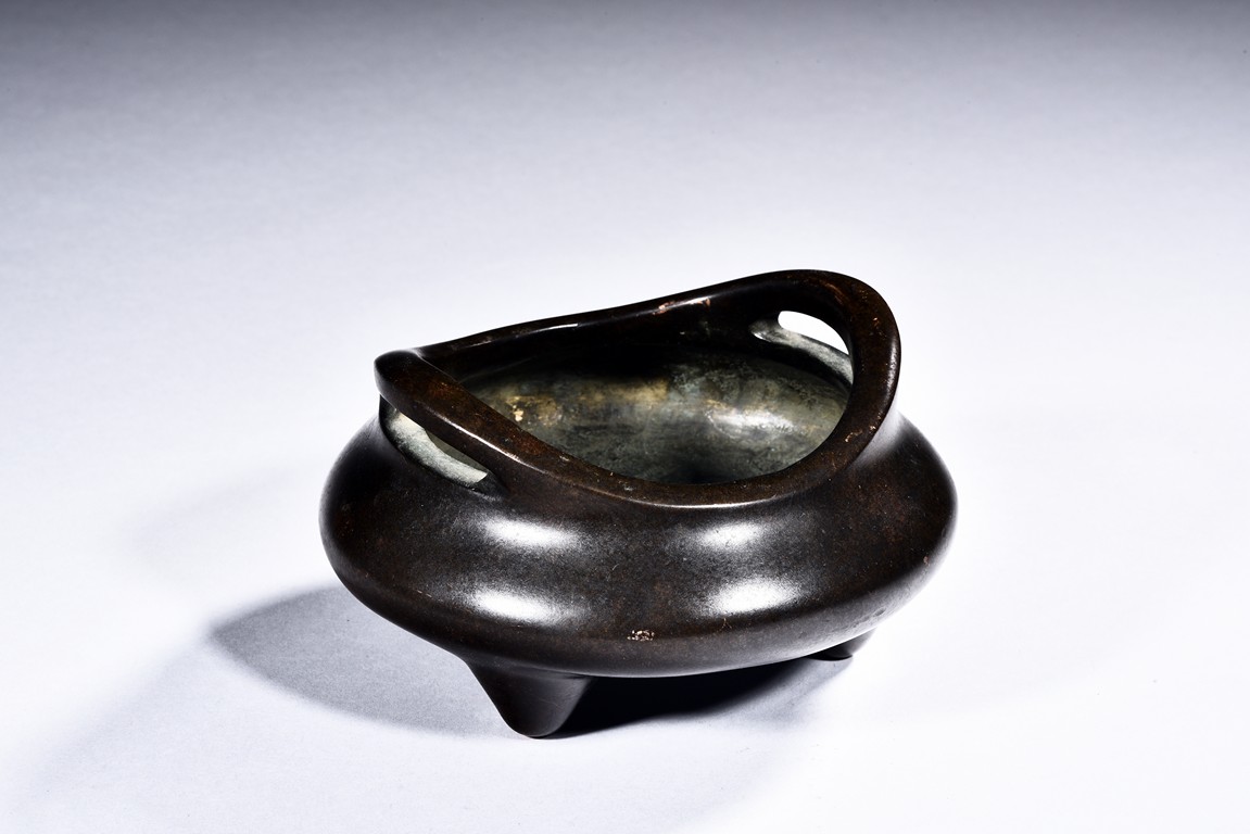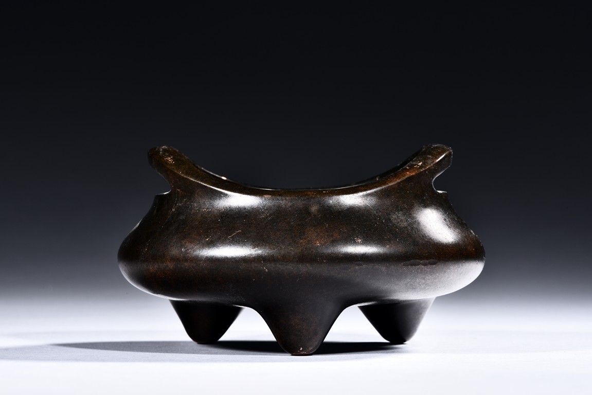 Heavily cast with a compressed body, the censer is raised on three conical feet, the mouth rim with a pair of handles that extend outward. The bottom bears a three character mark ‘Qin Shu Lv', or literally meaning 'the friend of music and book'. Qing Dynasty period.
