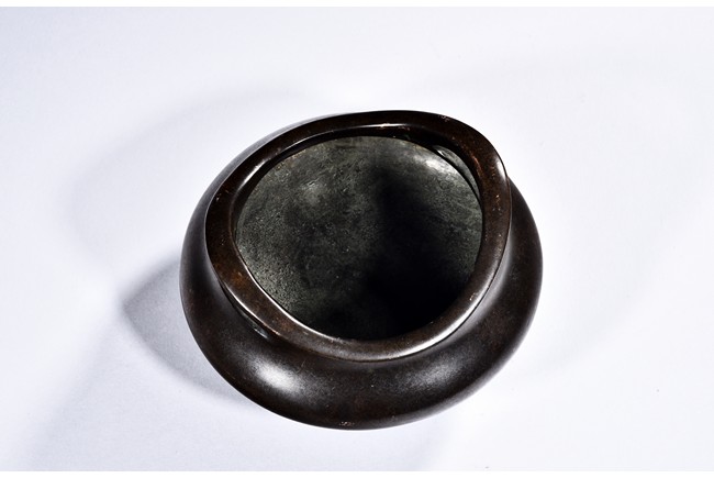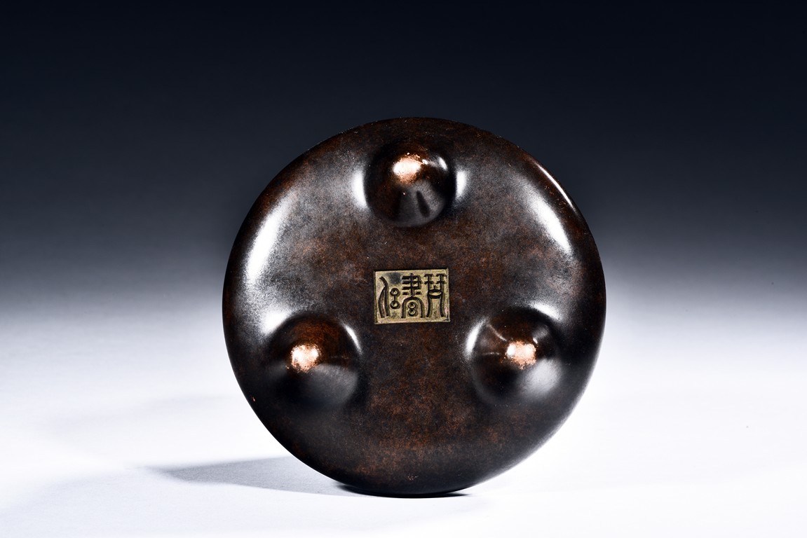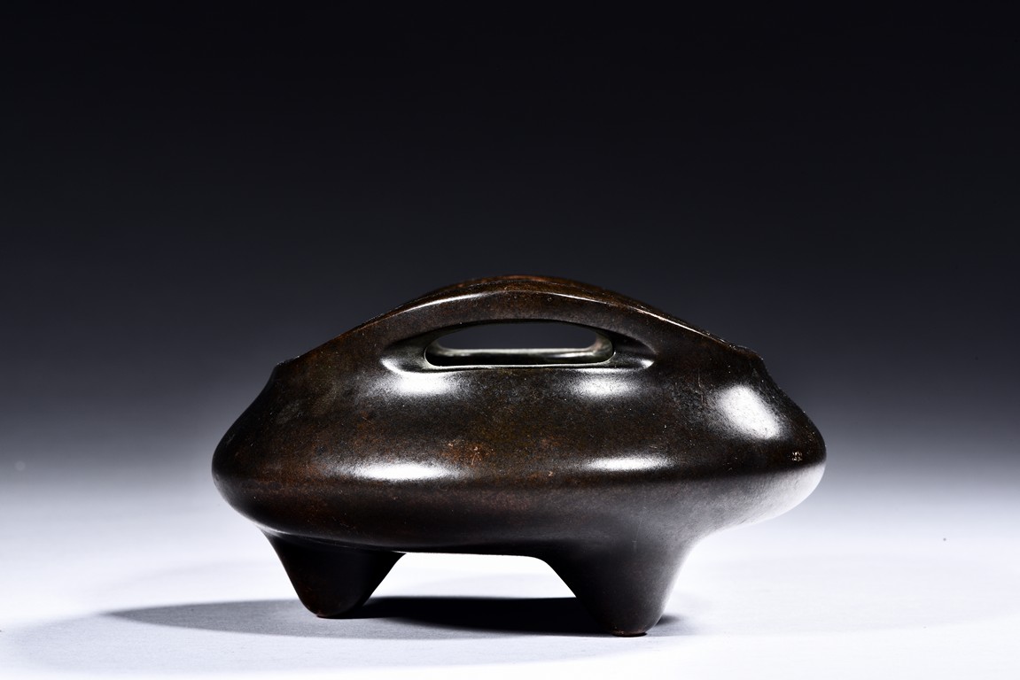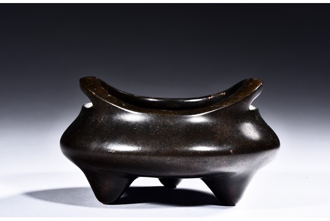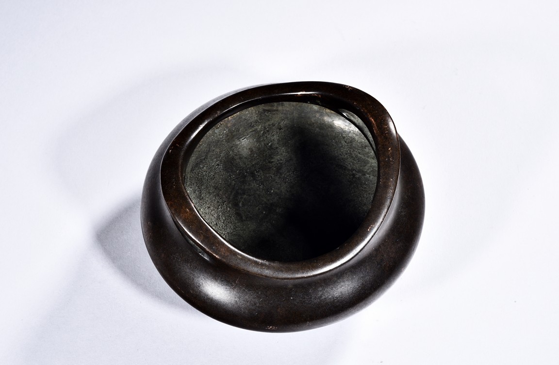 Heavily cast with a compressed body, the censer is raised on three conical feet, the mouth rim with a pair of handles that extend outward. The bottom bears a three character mark ‘Qin Shu Lv', or literally meaning 'the friend of music and book'. Qing Dynasty period.