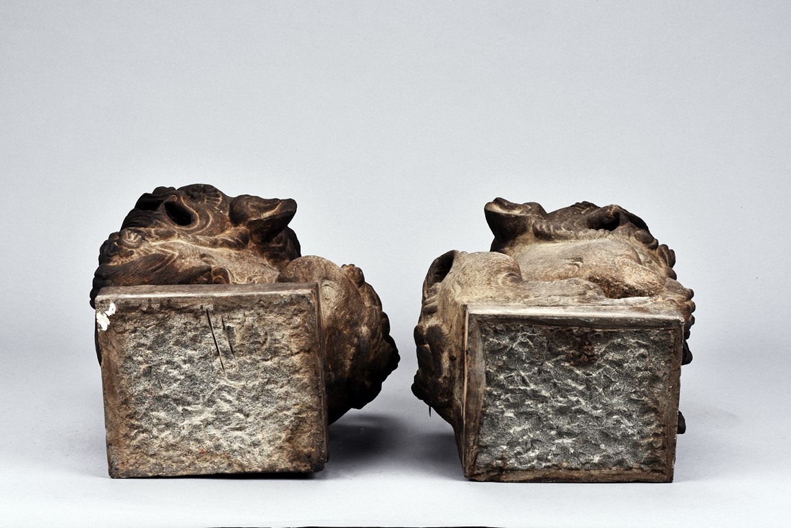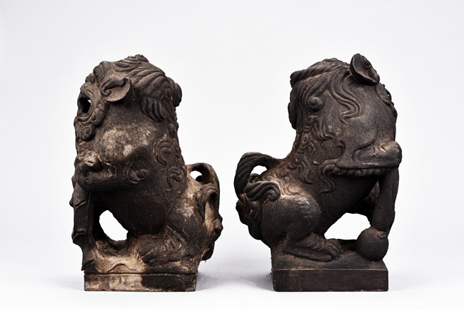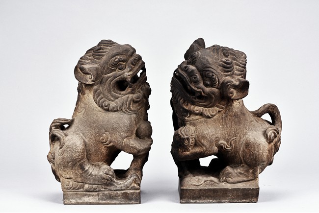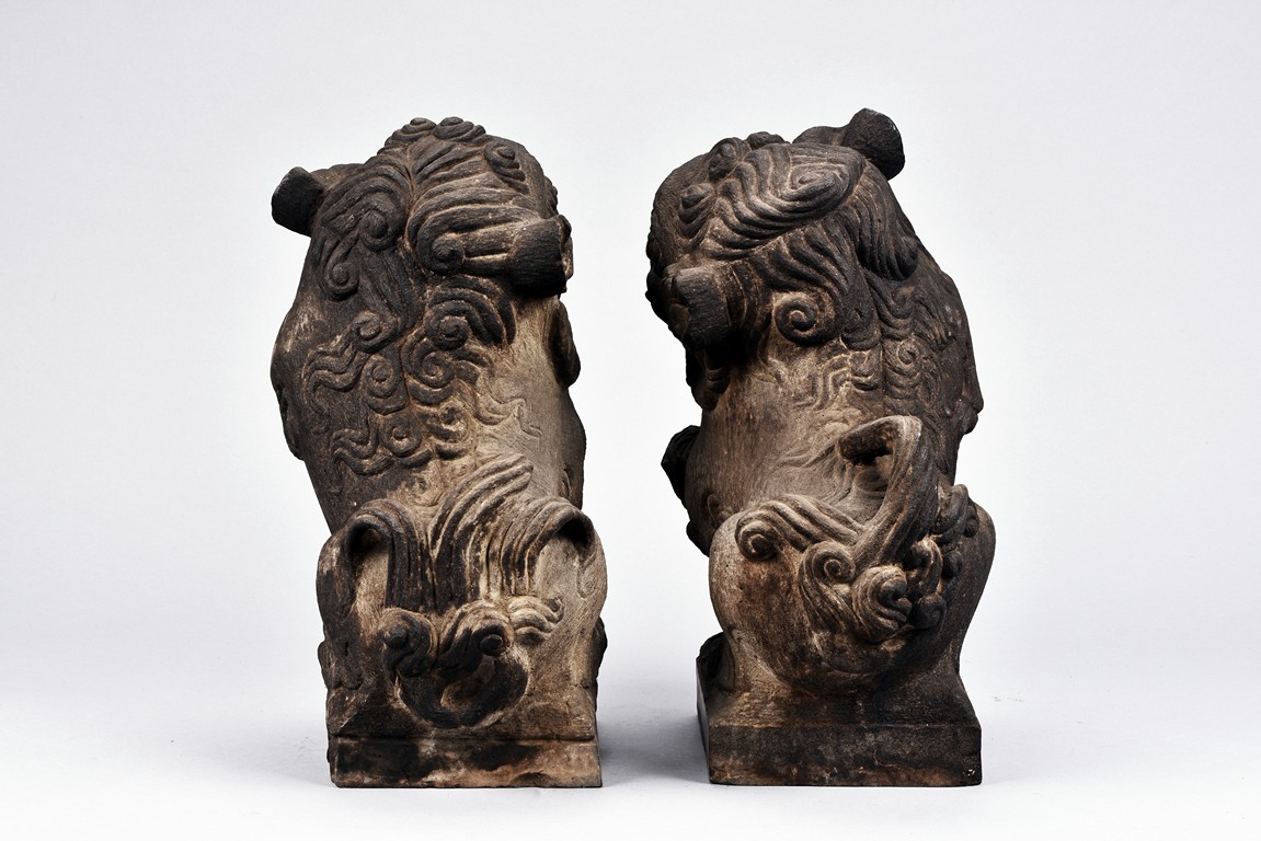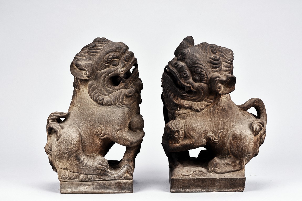 Supported on square pedestal, each is carved seated on haunches, the tails flicked upwards, with one paw raised grasping brocade ball, denoting male, the other with a cub over front paw, denoting female. Both with head raised revealing menacing teeth below ruyi-shaped nose. Qing Dynasty period.