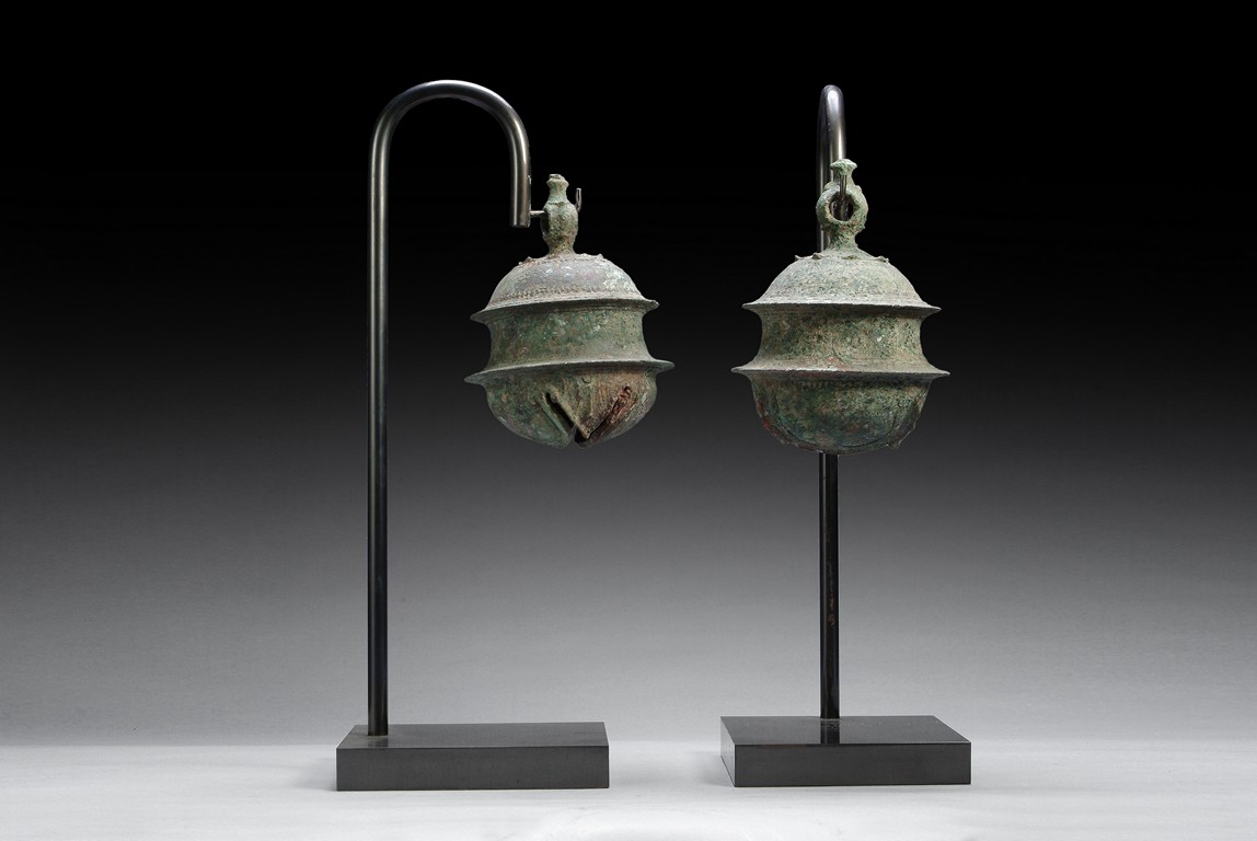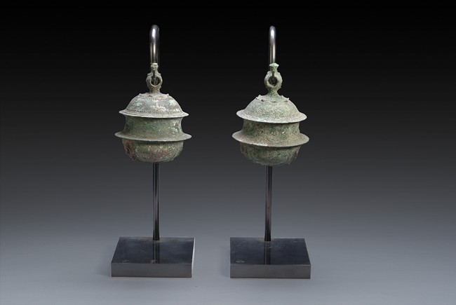 This pair of bells are gourd shaped, each with two fringes with bell openings placed prominently at the bottom, and each casted with a circular ring on the top. The pair with two display hanger stands. Warring States period.