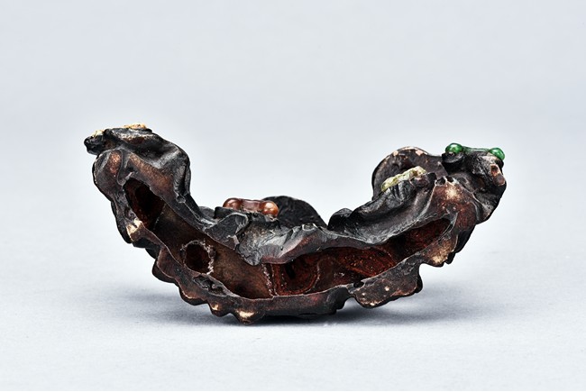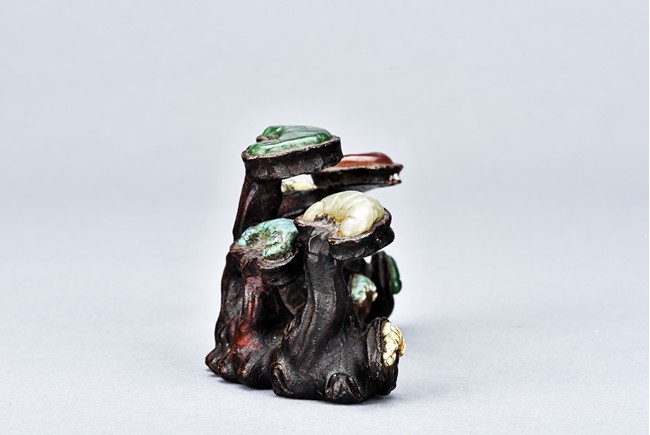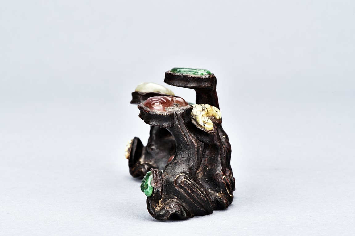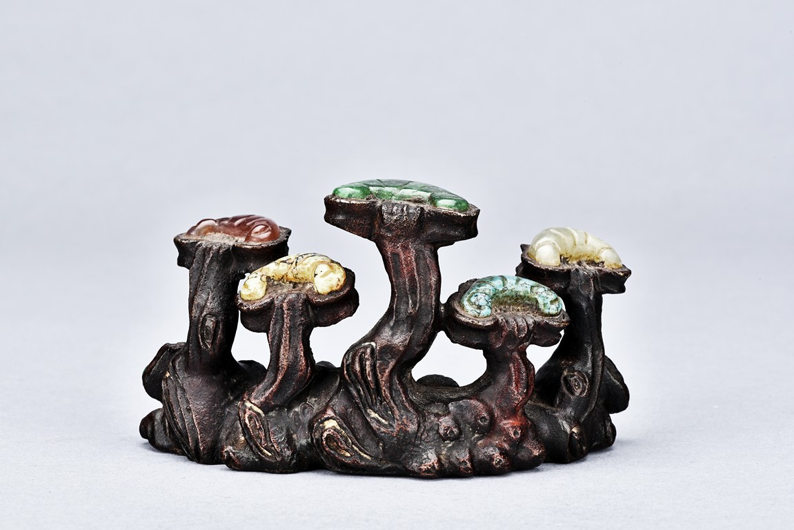 Modelled in the form of five irregular lingzhi head issuing from rocky outcrop bottom, each head is inlaid with semi-precious stone, including white jade, turquoise, agate, spinach jade. The bottom further embellished with four ruyi heads. Qing Dynasty period.