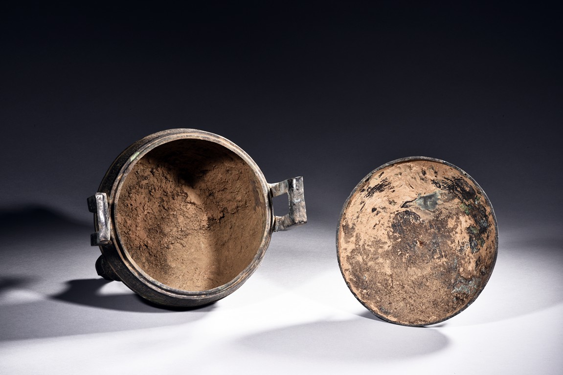 Standing on three tall curved legs, the domed cover and body decorated with repeated leiwen , flanked by projecting arched handles below the three small rings. Qing Dynasty period.
