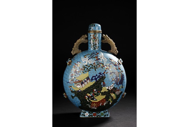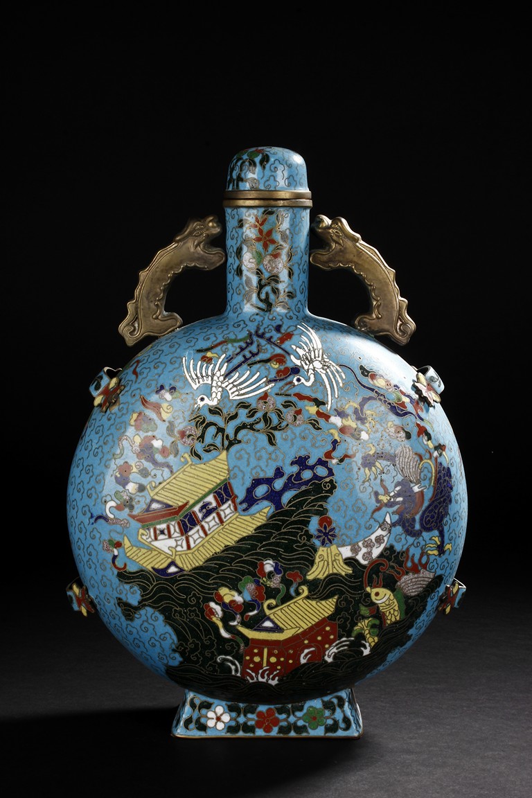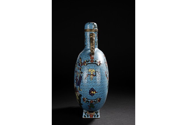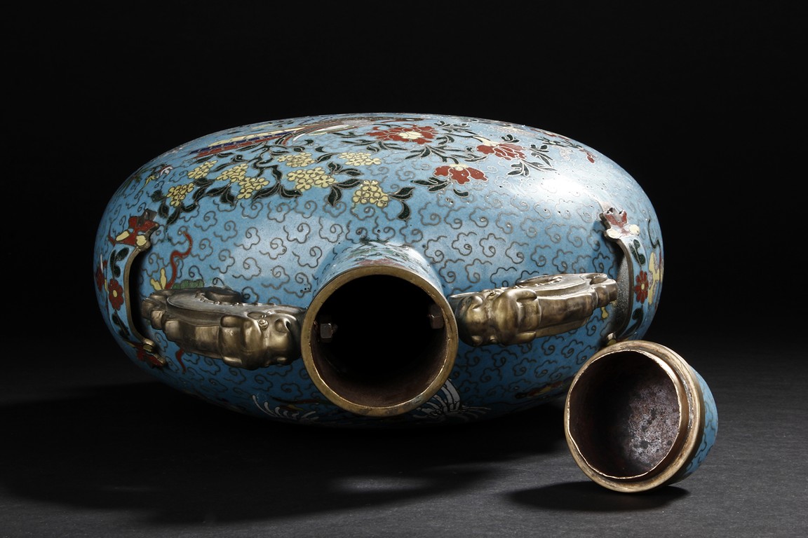 Of flattened circular body, the moonflask is enamelled on one side with scene of carp jumping over the dragon gate, the other side with two pheonix amongst leafy flowers issuing from rockwork, all reserved on turquoise ground with auspicious cloud motifs. The neck further decorated with two gilt mythical beast handles.