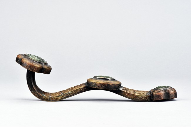 The quatrefoil ruyi head containing a spinach jade plaque of spinach jade, depicting scrolling foliage, framed in a border of key-fret pattern. The shaft having a phoenix design and embellished with ovoid spinach jade plaque, and the end of the scepter inset with spinach jade of similar floral design.