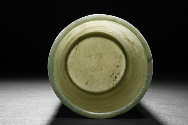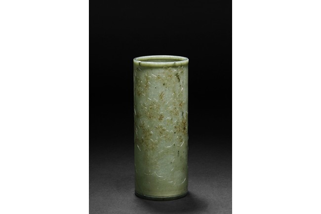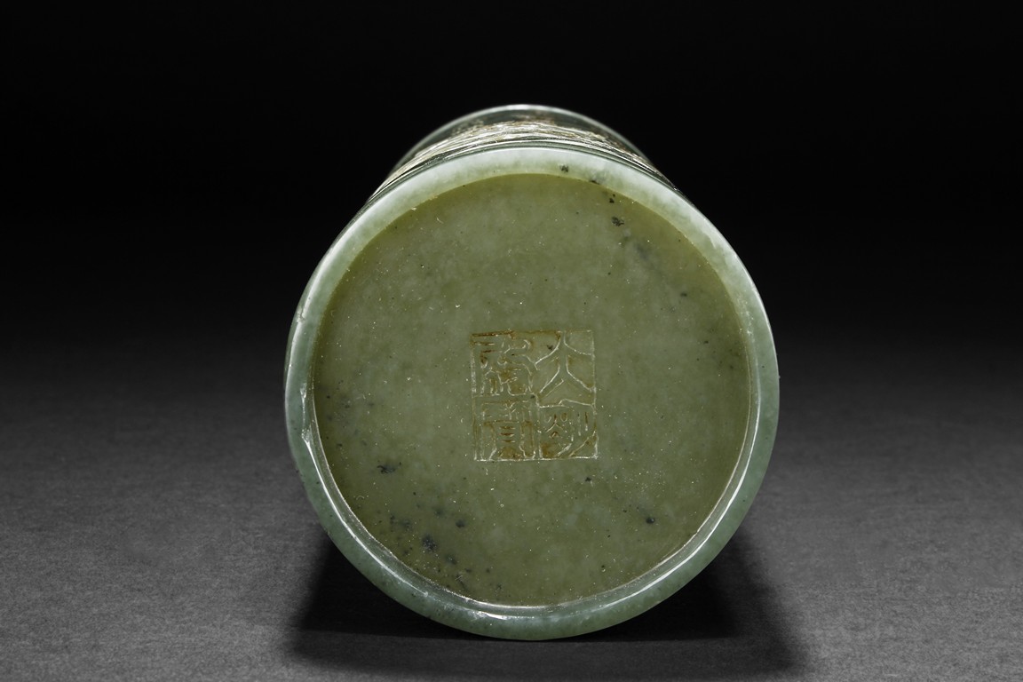 The brush pot is carved in cylindrical form, the exterior finely incised with poems in seal format, above a continuous landscape of plum, chrysanthemum, and bamboo issuing from rock-work. The bottom bears four character mark. The stone is of celadon tone. Republic period.
