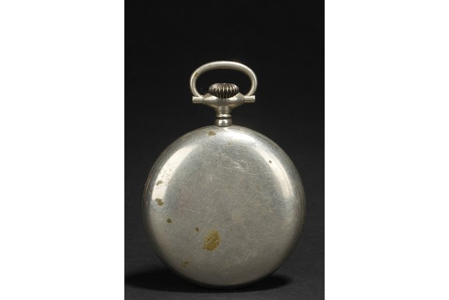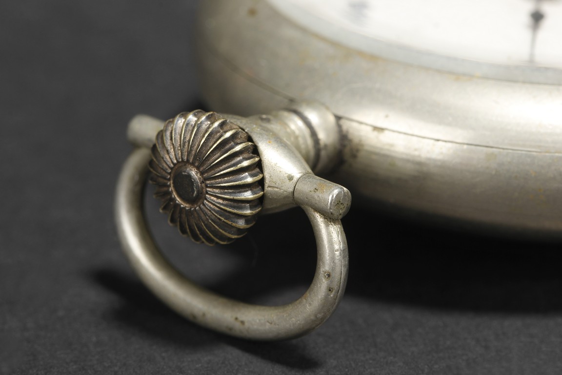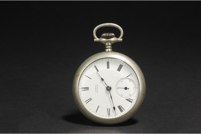An A.W.Co. pocket watch, white watch face with black Roman Numeral watch indicators, silver metallic frame, turning knob finial surrounded by a loop ring on top.