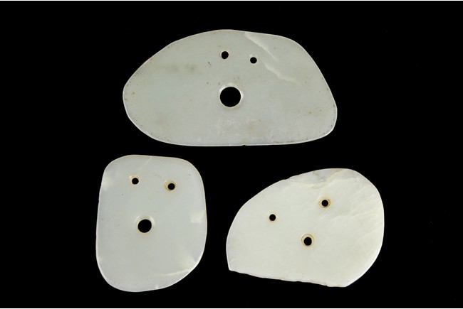 Each white jade shaped irregularly, with two smaller hole and one large hole in the center in triangular shape; the stone of translucent white color, with a little russet. Ming Dynasty period.