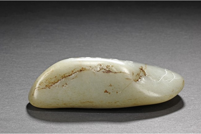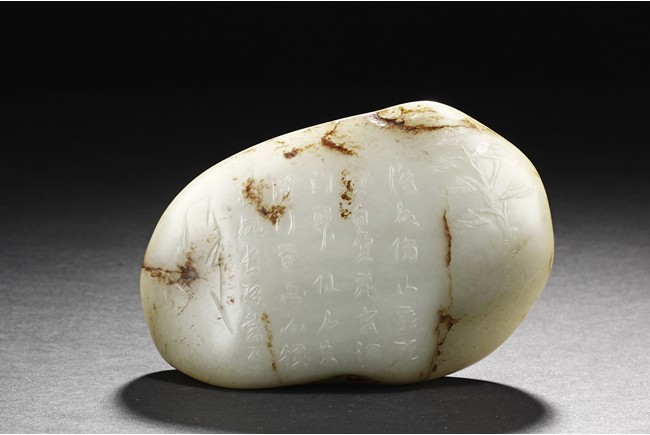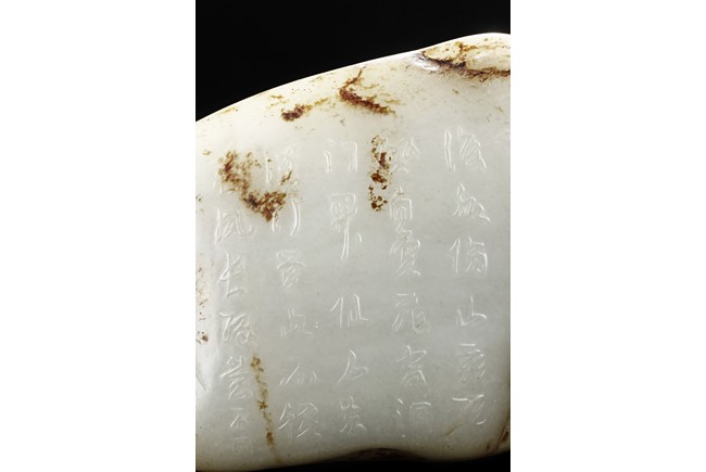 The decorative ornament boulder made from Hetian jade, carved on one side with elder and attendant crossing the bridge in a river scenery, the reverse carved with Chinese poetry, the Hetian jade stone of white color with occasional russet areas. Qing Dynasty period.