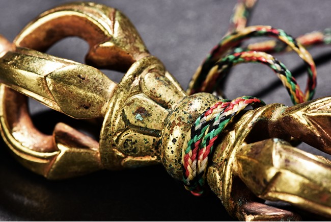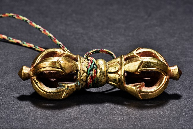 The vajra is constructed with four prongs issuing from makara heads, the central knop flanked by lotus friezes.