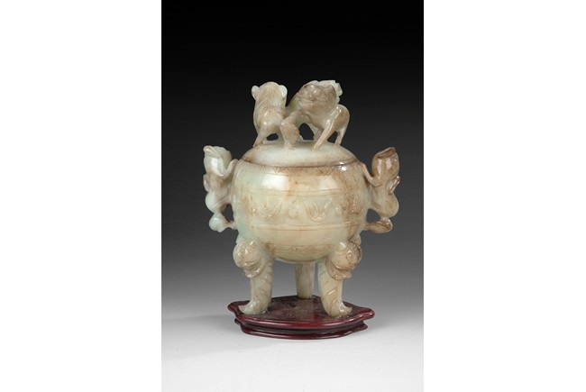 Of globular shape, stands on three long legs extended from beast masks, a pair of mythical beast form handles on the side, body carved with scrolling patterns, and three mythical beasts acting as finial on the cover. 19th century.