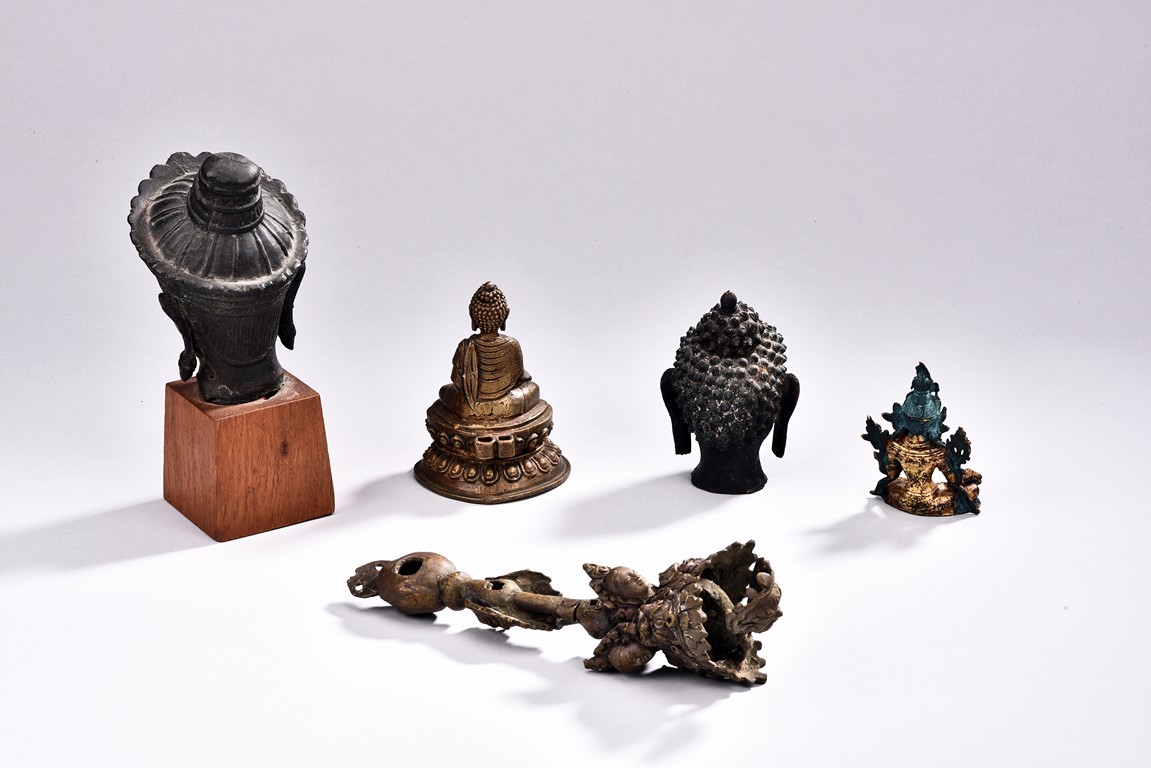 Comprise of two southeast asian bronze buddhisattva head, one Tibetan bronze shakyamuni statue on double lotus base, one gilt-bronze